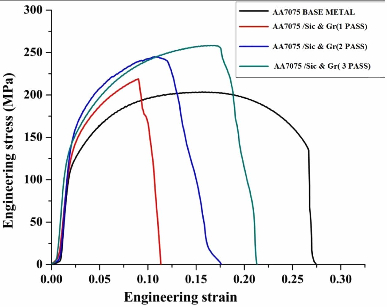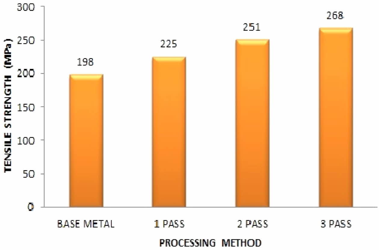 • The ultimate tensile strength of 3 pass FSP AA7075/ SiC & Gr is 26.12% higher than the base material AA7075.