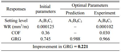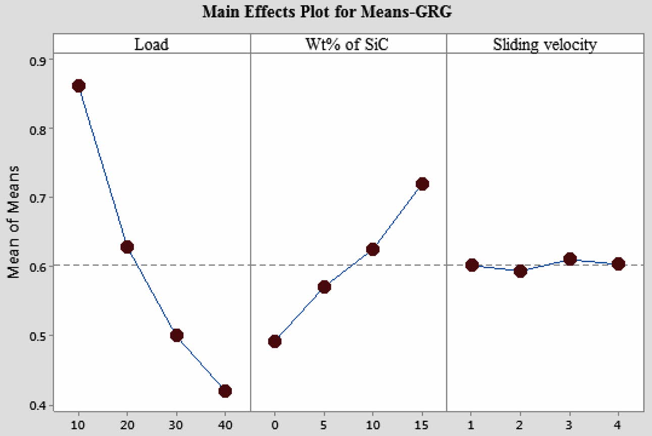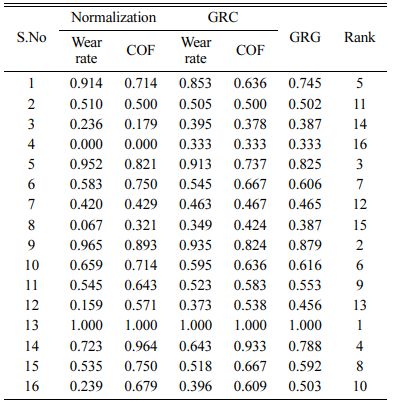 With the help of Minitab’17 the objective function’s S/N ratio values were calculated and the results were plotted in Table 2. Grey relational analysis is one of the well-known methods amongst multiple criteria decision making grey techniques. It has one important a bene- ficial feature is the ability to measure quantitative and qualitative relationships between variables and factors using a comparatively small amount of data. The GRA was performed to determine the optimum process variables for combined multi objective of minimum wear rate and COF of the AA7075-SiC-Gr surface com- posites. Smaller is better was selected as the objective function of the wear rate and COF of the AA7075-SiC-Gr surface composites. By using the standard GRA mathematical formulas, grey relational coefficients (GRC) and grey relational grades (GRG) were obtained. The GRG can acquire the optimum combination of the control parameters, and the contribution of each experimental parameter combination. The result of S/N ratios and their delta values were used to rank the wear parameters to study their influence on the combined objective function as shown in Table 4, the combination of minimum wear rate and COF is obtained at 13th experiment for maxi- mum GRA values which indicates the best combined objective.