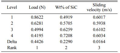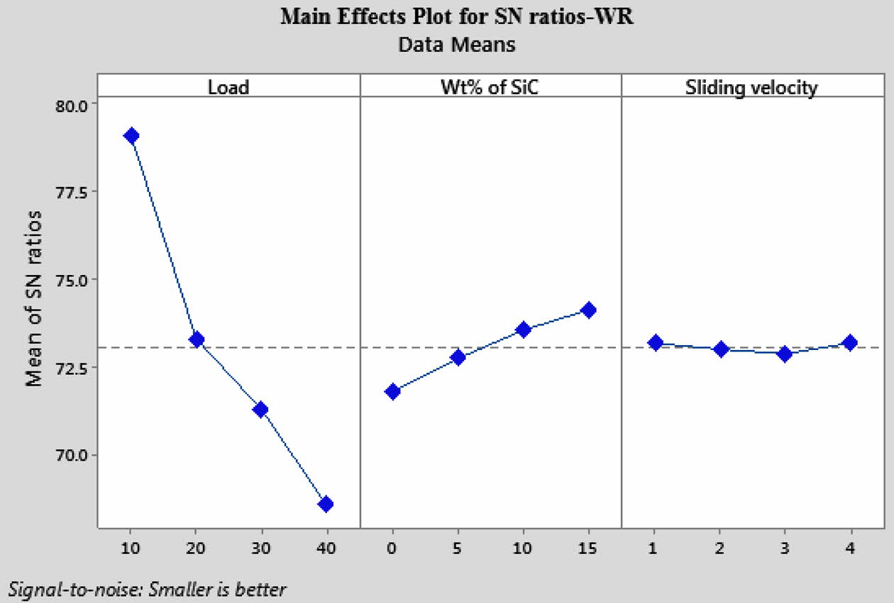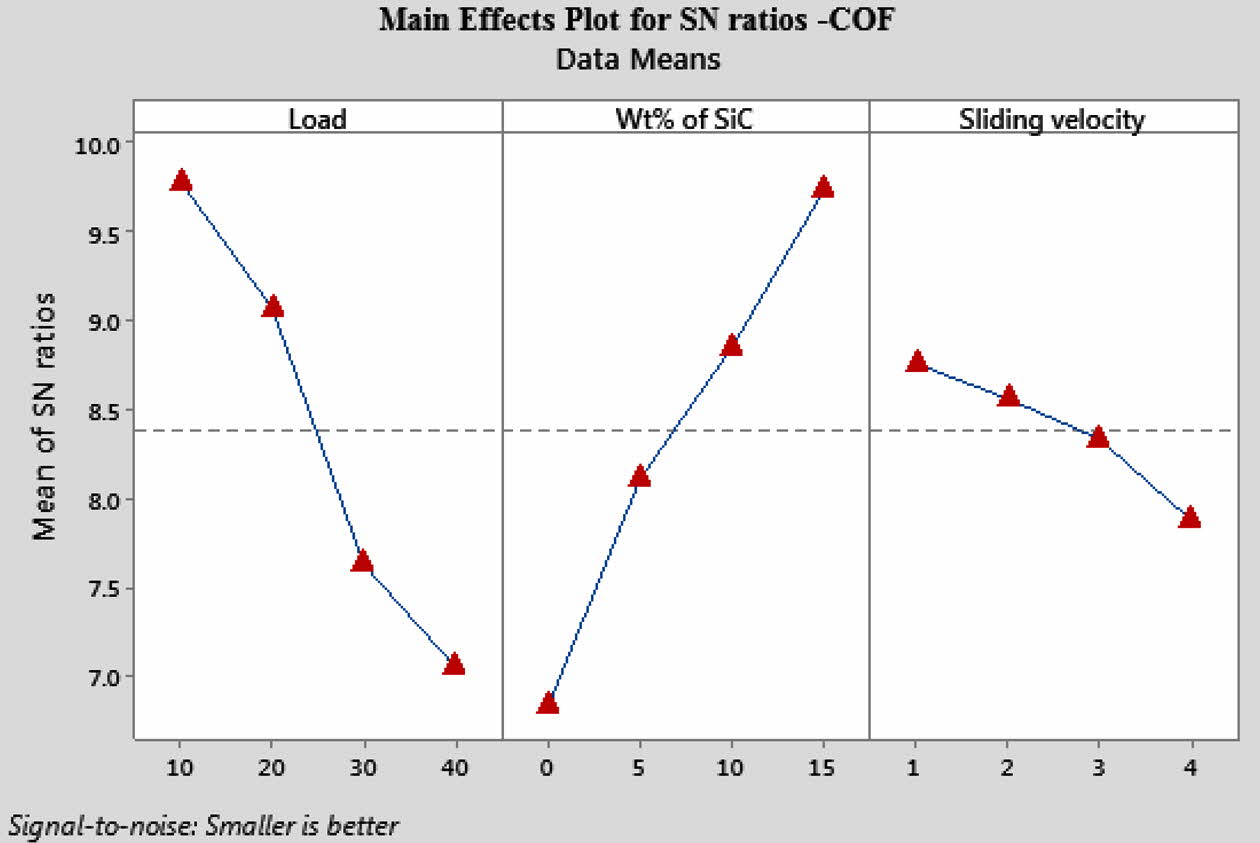 Similarly single objective optimization also performed to identify the individual dominance on wear and COF. SN ratio for both wear and COF was plotted in Table 8. Based on the table analysis, load dominant high on wear and reinforcement is more dominant on wear. Minimum wear rate is achived due to formation of self-lubrication while using SiC and Gr homogeneous mixture on the AA7075 surface. These results are highly matched with Prabu [24]. Mean effects plot for wear and COF was shown in Fig. 13 and 14 respectively. For optimized wear specimen, 10 N load 15% of SiC and 4 m/s sliding velocity was preferred. At the same time, for minimum friction rate, 10 N load 15% of SiC and 1 m/s sliding velocity was preferred. Based on single and multi-objective optimization, 10 N load and 15 wt.% of SiC was preferred for 3pass FSP specimen.