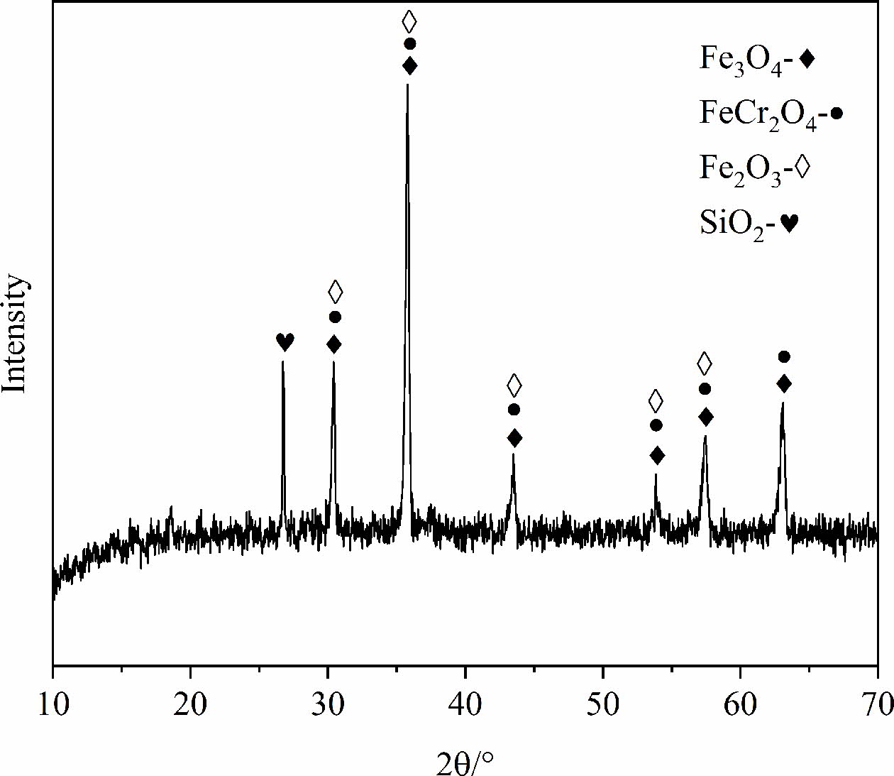 The SSD used in this experiment was collected by a stainless steel plant in the southwest of China, of which the main composition is shown in Table 1. It can be found that the contents of Fe2O3, Cr2O3, MnO and NiO in the SSD are high. Fig. 1 is the XRD patterns of SSD and shows that the main phases of it are Fe3O4, FeCr2O4, Fe2O3 and SiO2. The particle size distribution of SSD (as shown in Fig. 2) indicates the dust particles are fine and the particle size can be roughly divided into smaller particles 1~10 mm and larger particles 10~100 mm. The high contents of transient elements and small particle size of SSD manifest that it can be used as a good raw material to prepare black ceramic pigments.