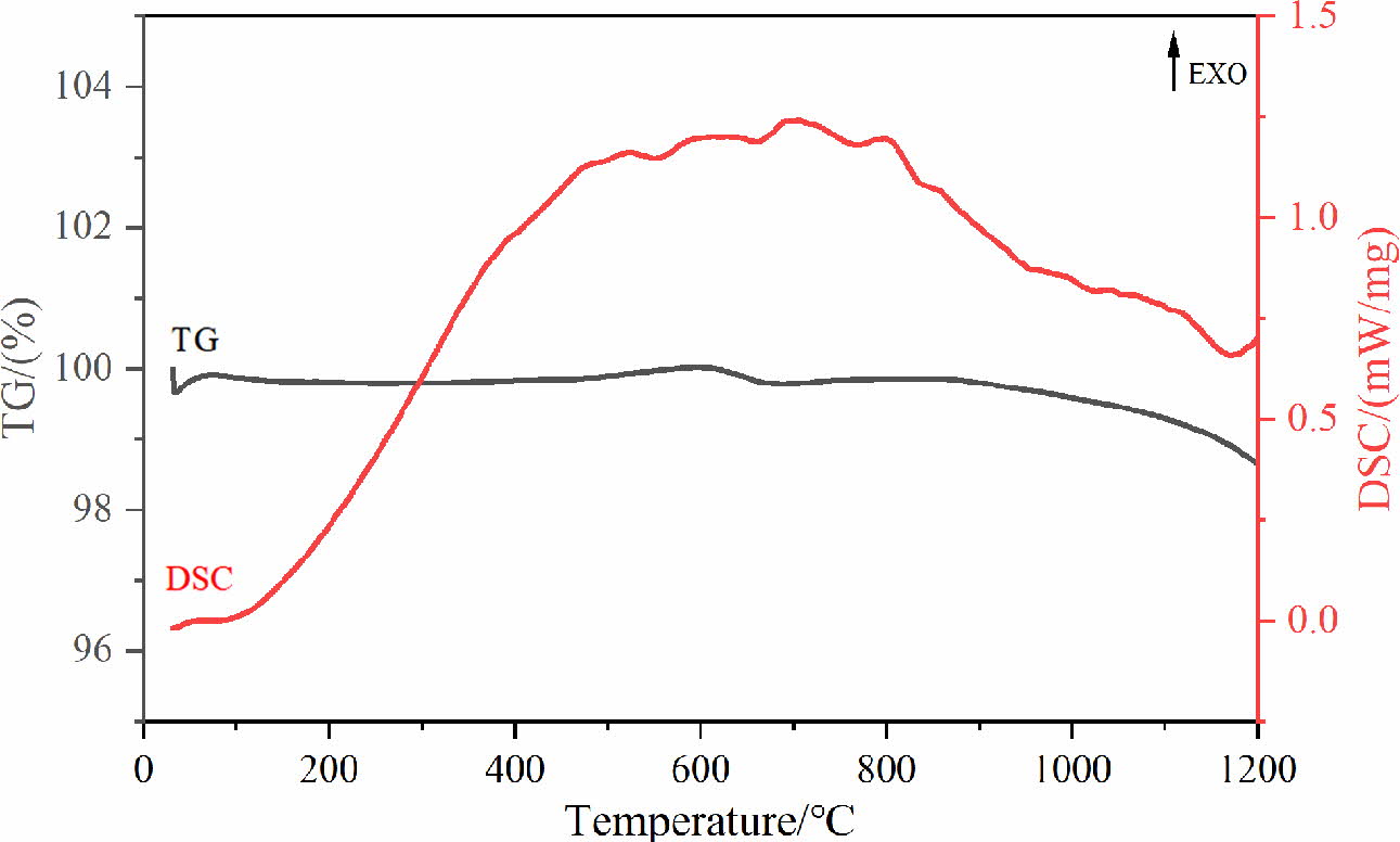 Fig. 3 is the TG-DSC result of the mixture for pigment preparation. It can be found from Fig. 3 that the process of pigment synthesis can be divided into several different stages. At first, NiO and MnO in the raw material will be oxidised to Ni2O3 and Mn2O3 respectively, which corresponds to the mass increase and exothermic peak of the curve at 100~600 oC. Sub- sequently, the mass loss of TG curve at 600 oC attribute to that Ni2O3 decomposes into NiO and releases oxygen [30]. When the temperature rises to 700 oC, the exothermic peak drops significantly, indicating that the solid-phase synthesis reactions of spinel occur [31]. When the temperature rises about 1100 oC, the mass loss result from the decomposition of spinel phases (such as Cr-containing spinel and Mn-containing spinel) and the release of a small amount of oxygen [12, 32]. Therefore, the calcined temperature of 900 oC can not only satisfy the occurrence of solid-phase reactions but also prevent the decomposition of spinel phases.