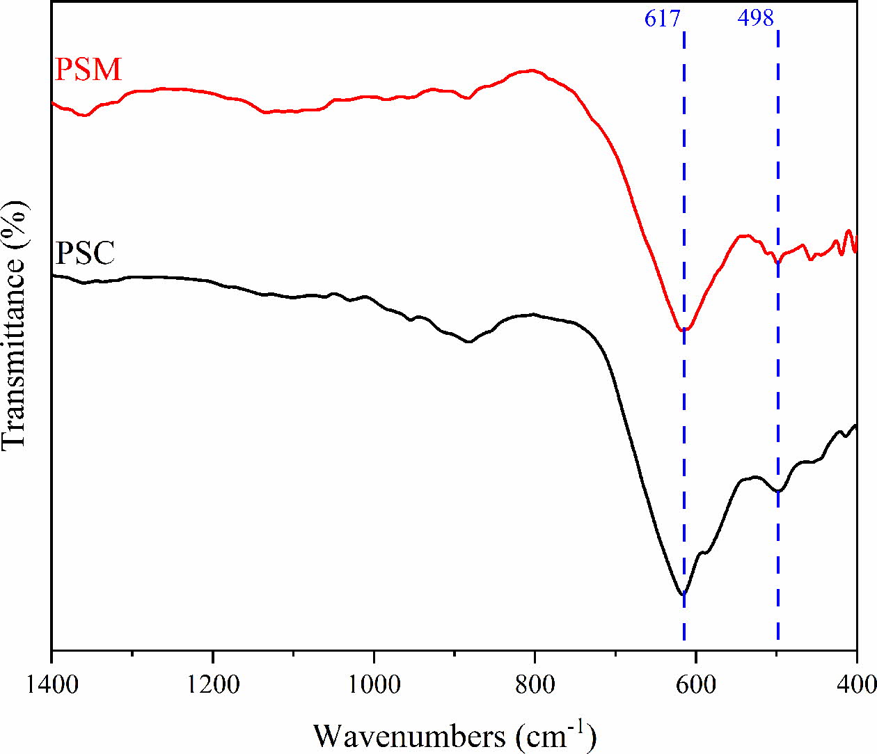 FT-IR analysis was performed to verify the phase structure of the prepared pigment samples. Fig. 5 shows the FT-IR spectra of pigments under different preparation processes. As shown in Fig. 5, there are two peaks near 617 cm-1 and 498 cm-1, among which the peak of 617 cm-1 belongs to the stretching vibration of spinel octahedral position, and 498 cm-1 corresponds to the stretching vibration of spinel tetrahedron [34]. Therefore, it can be seen that the stretching vibration peaks of spinels in PSM are wider and deeper than PSC, and this demonstrates that the content of spinel phases in PSM is more. The above result is consistent with the XRD analysis.