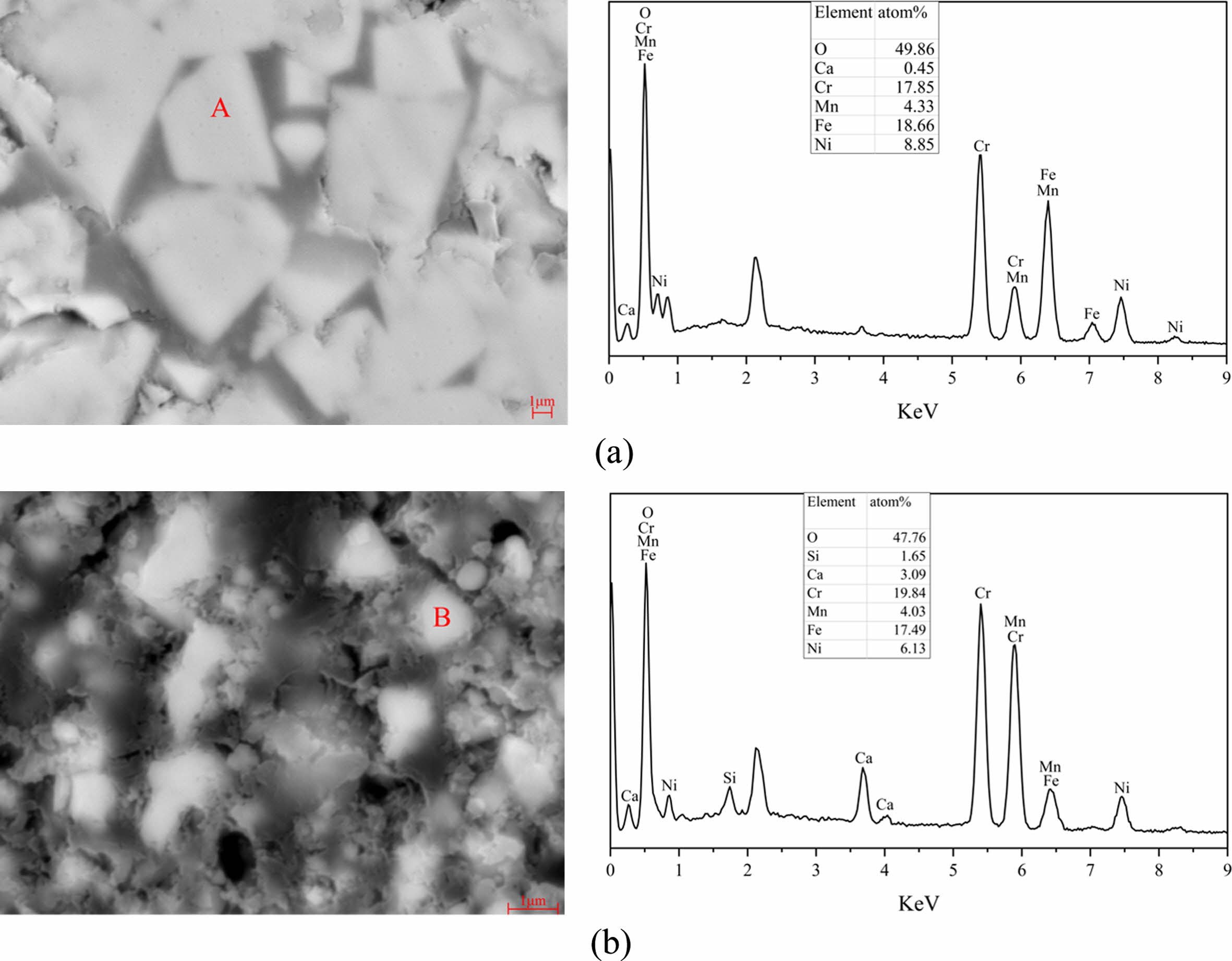 The comparison of micromorphology between the PSM and PSC is shown in Fig. 8. From the Fig. 8, the PSM shows typical spinel micromorphology (regular polyhedron), while the PSC shows an obvious irregular shape. In addition, the average particle size of PSM is larger than the PSC. The EDS analysis results at points A and B in Fig. 8 show that the pigment samples main content is the mixed spinel phase composed by Fe, Cr, Ni and Mn, and also contain a small number of impurity elements brought in by the SSD.