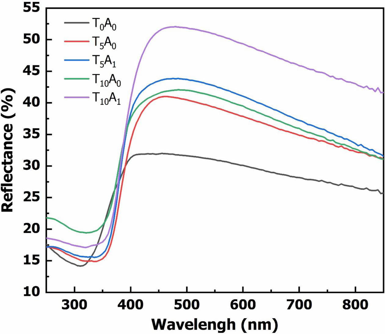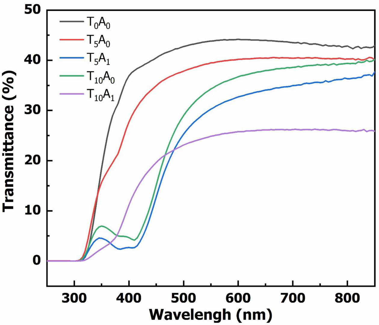 Fig. 2. shows transmittance spectrum of glass samples after vitrifying at 1,200 oC for 90 min. The results of the transmittance spectrum in Fig. 2. showed that the background glass (sample T0A0) had the highest transmittance. This property demonstrated the optical transparency of the BBZ. However, with the addition of TiO2 to the base glass (T5A0 and T10A0), the transmittance of the glass system decreased. The transmittance of the system continued to decrease with increasing TiO2 content from 5% to 10%. When Ag/TiO2 was added to the base glass system (T5A1 and T10A1), the transmittance decreased compared with the sample only adding TiO2.