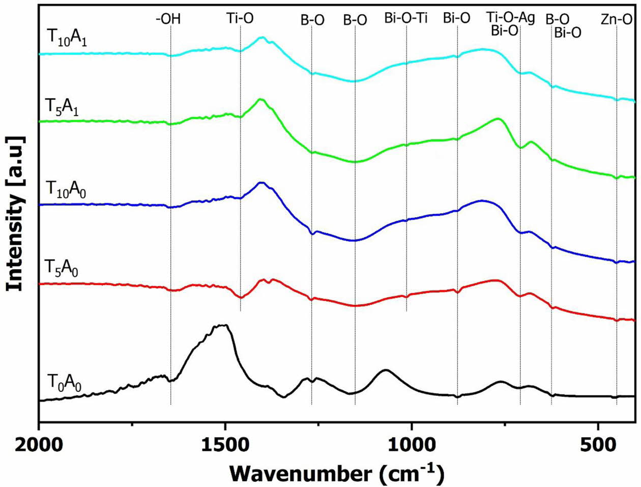 With the glass samples only adding TiO2, besides the characteristic vibrations of the BBZ, the FTIR spectrum of T5A0 and TA0 also appeared to vibrate at wavenumber position 1,456-1,465 cm-1 and 1,057 cm-1. These vibrations are characteristic of the Ti-O-Ti bond and the Bi-O-Ti bond [19, 23]. The Ti-O-Ti bond demonstrated the presence of TiO2 distributed in the base glass. As mentioned in Fig. 3., the band gap energy of the BBZ increased when TiO2 was added to the composition. This result is contrary to most previous studies on the addition of TiO2 to the base glass [24, 25]. In this study, TiO2 content was used in a large amount (5-10% compared to 0-2% TiO2 of previous studies). The vibrations of Bi-O-Ti and Ti-O-Ti simultaneously appeared on the FTIR spectrum, indicating that TiO2 not only participates in binding with bismuth to form glass but also exists in free form. The free TiO2 extended the band gap of the BBZ. With the additional samples Ag/TiO2, the wavenumber at 702-708 cm-1 on the FTIR spectrum of T5A1 and T10A1 has an absolute intensity higher than other samples. This wavenumber position corresponds to the position of the Ti-O-Ag bond [26]. The Ti-O-Ag bond causes an additive effect to increase the intensity of the vibration at 702-708 cm-1. The interaction between Ag and TiO2 formed the Ti-O-Ag bond. The formed bond has reduced the band gap energy of the BBZ, as shown in Fig. 3. and Fig. 4.