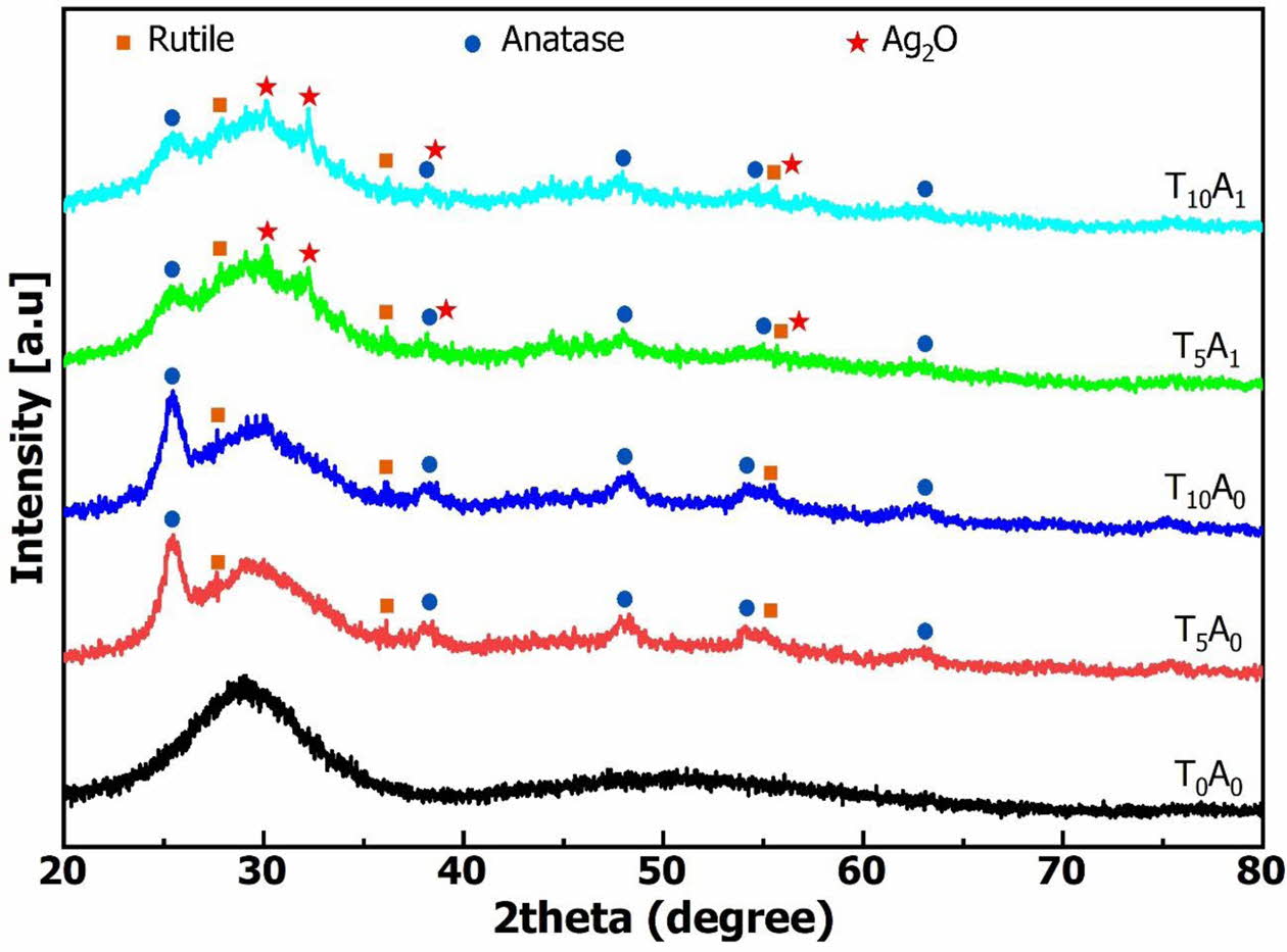 For samples using silver (T5A1 and T10A1), the XRD patterns in Fig. 7 showed the presence of Ag2O. Ag2O (JCPDS 41-1104) was shown at the diffraction positions of 26.7o, 32.8o, 38.1o, and 54.9o in Fig. 7 [29]. As analyzed, the FTIR spectrum (Fig. 5) of T5A1 and T10A1 appeared vibration corresponding to the Ti-O-Ag bond. This binding demonstrated that silver bound to titanium and reduced the band gap energy (Fig. 4). However, the amount of silver did not react completely but was oxidized under temperature to form Ag2O. So, the XRD patterns showed the presence of Ag2O. The free Ag2O present in glass will also promise to improve the bactericidal ability of this material.