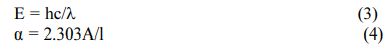 The E value of the function (2) is determined from UV-Vis results according to formula (3). The value of absorption coefficient α of function (2) is determined from UV-Vis results and Beer – Lambert's equation according to formula (4). Where A is the absorbance and is determined on the UV-Vis spectrum, l cm is the thickness of the sample.