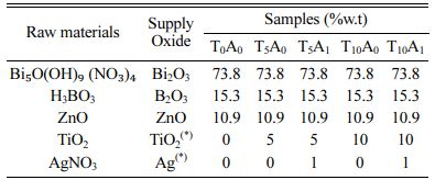 The chemical composition of the BBZ was chosen by considering the equilibrium phase diagram of the ternary system of the BBZ [14]. The selected basic chemical compositions were (% wt.): 73.8% Bi2O3, 15.3% B2O3, and 10.9% ZnO. TiO2 and Ag/TiO2 were added into the basic glass compositions according to the ratios given in Table 1. The raw materials used in this study are also presented in Table 1. The samples were fabricated as shown in Fig. 1. The raw materials were mixed. The mixtures were formed into glass by using conventional melt quenching techniques. The muffle furnaces (L5/13/P330 Nabertherm model) was used to melt each batch of this glassware in a Pt crucible at 1,200 oC for 90 minutes. The heating rate was 5oC/min. Glasses after vitrifying were milled in a planetary mill for 2 hours to obtain a fine glass powder with sizes passed through a sieve with 125 µm.
