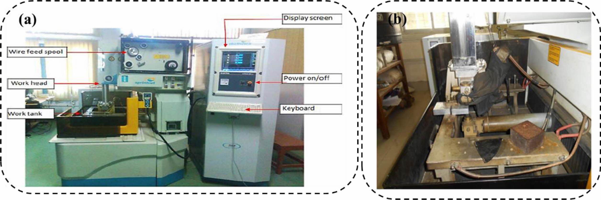 Fig. 2 (a) Pictorial View of WEDM Machine Tool, (b) Experimental setup. |