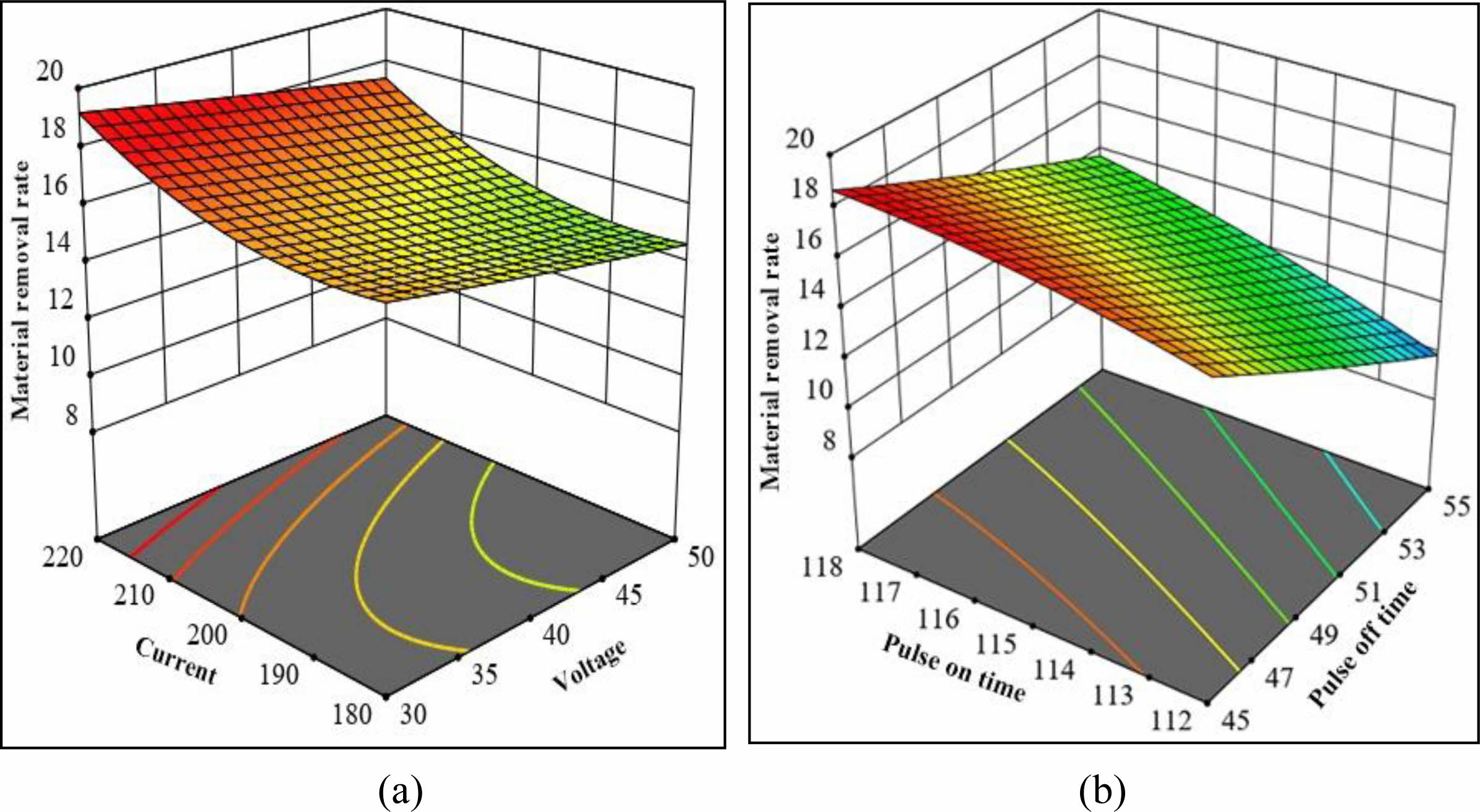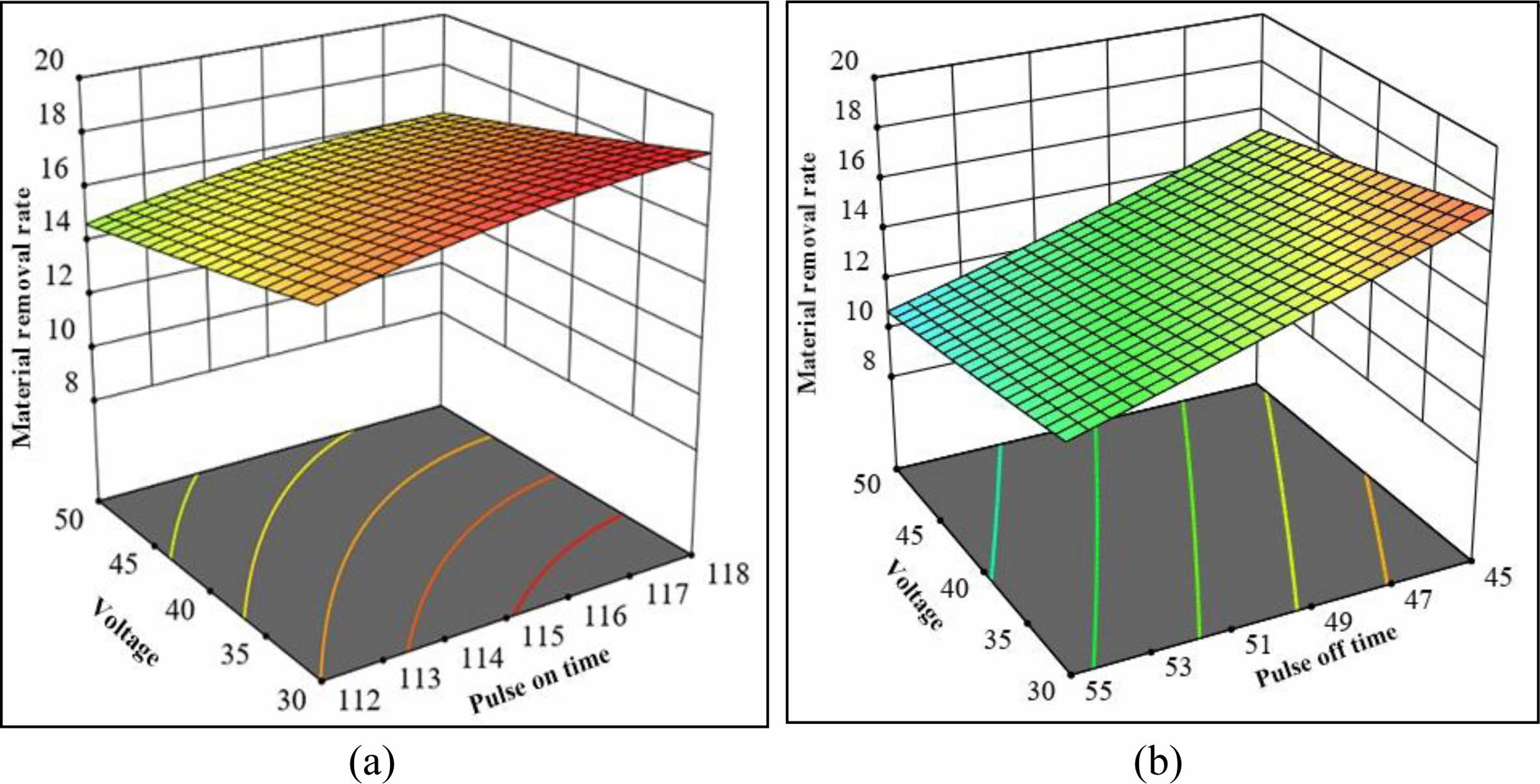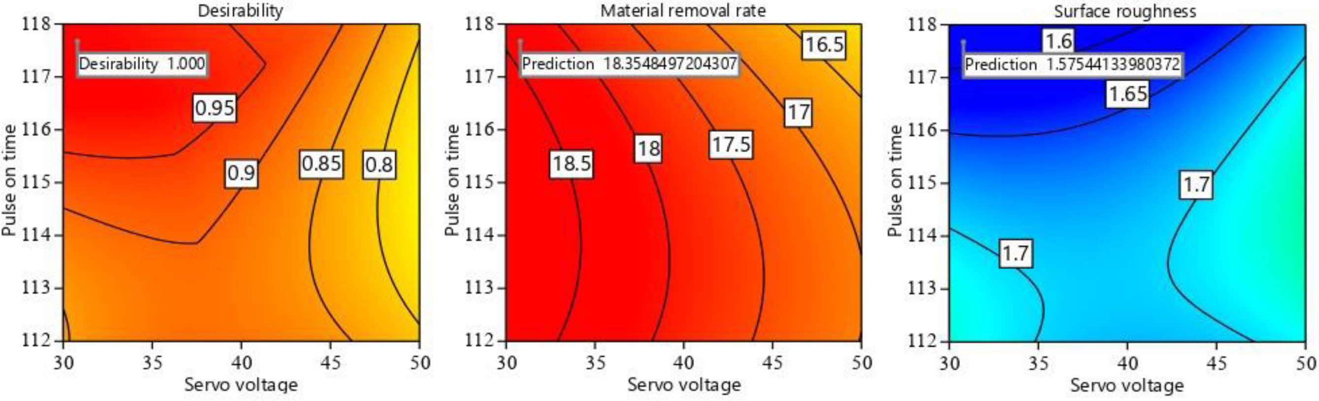 Fig. 4(a) depicts the interaction effect of peak current and servo voltage on MRR. The causes for the rise in MRR owing to an increase in peak current and the decrease in MRR due to an increase in servo voltage. Fig. 4(b) depicts the interaction effect of pulse off time and pulse on time on MRR. The rise in MRR is related to an increase in pulse on time, whereas the drop is due to an increase in pulse off time due to the previously mentioned reason.