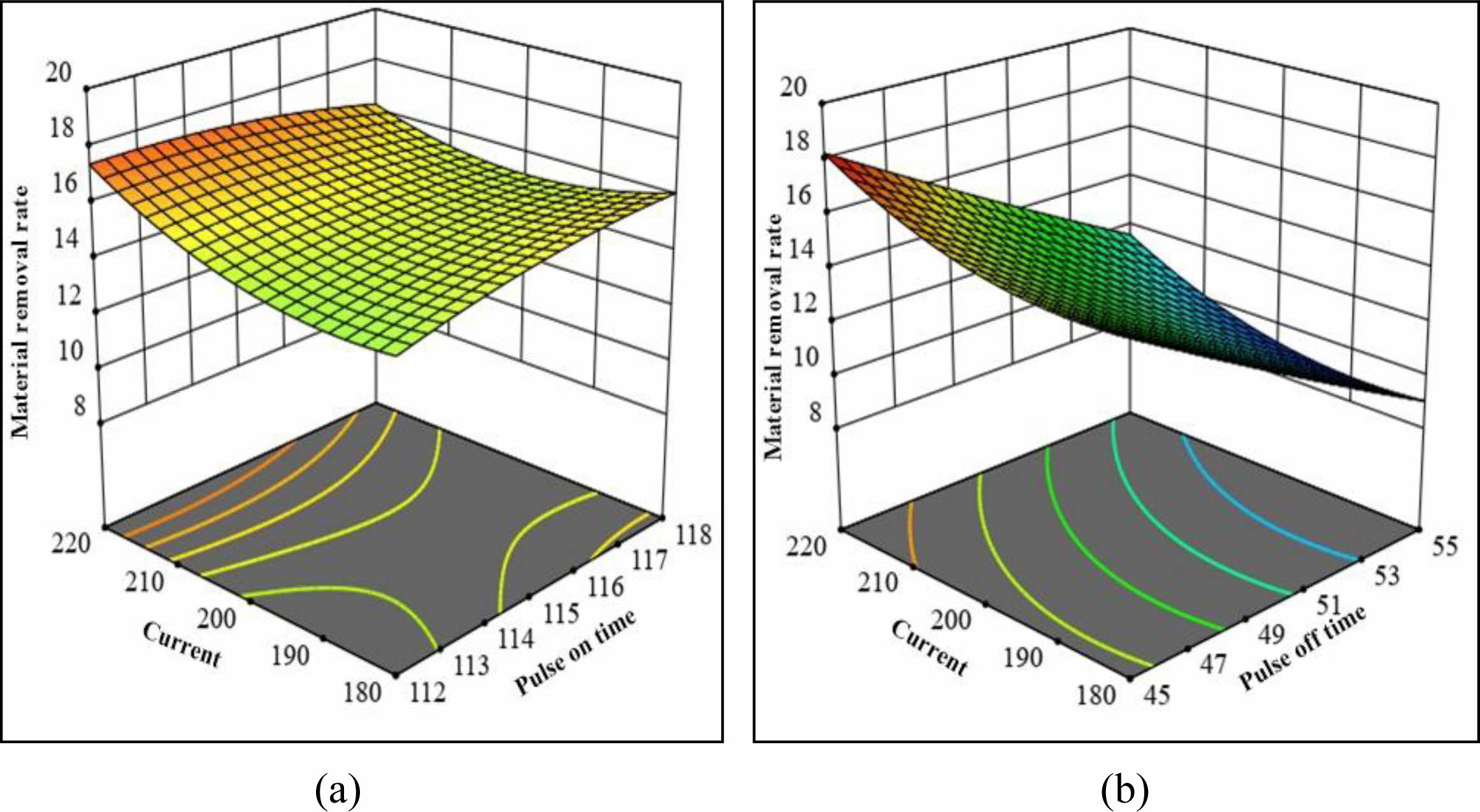Fig. 5(a) and 5(b) depicts the interaction effect of pulse on-time, pulse off time and peak current on MRR. The explanation for the rise in MRR due to an increase in pulse on time and an increase in peak current is the same as previously stated. The rise in MRR is related to an increase in peak current, whereas the decrease in MRR is due to an increase in pulse off time, as previously stated.