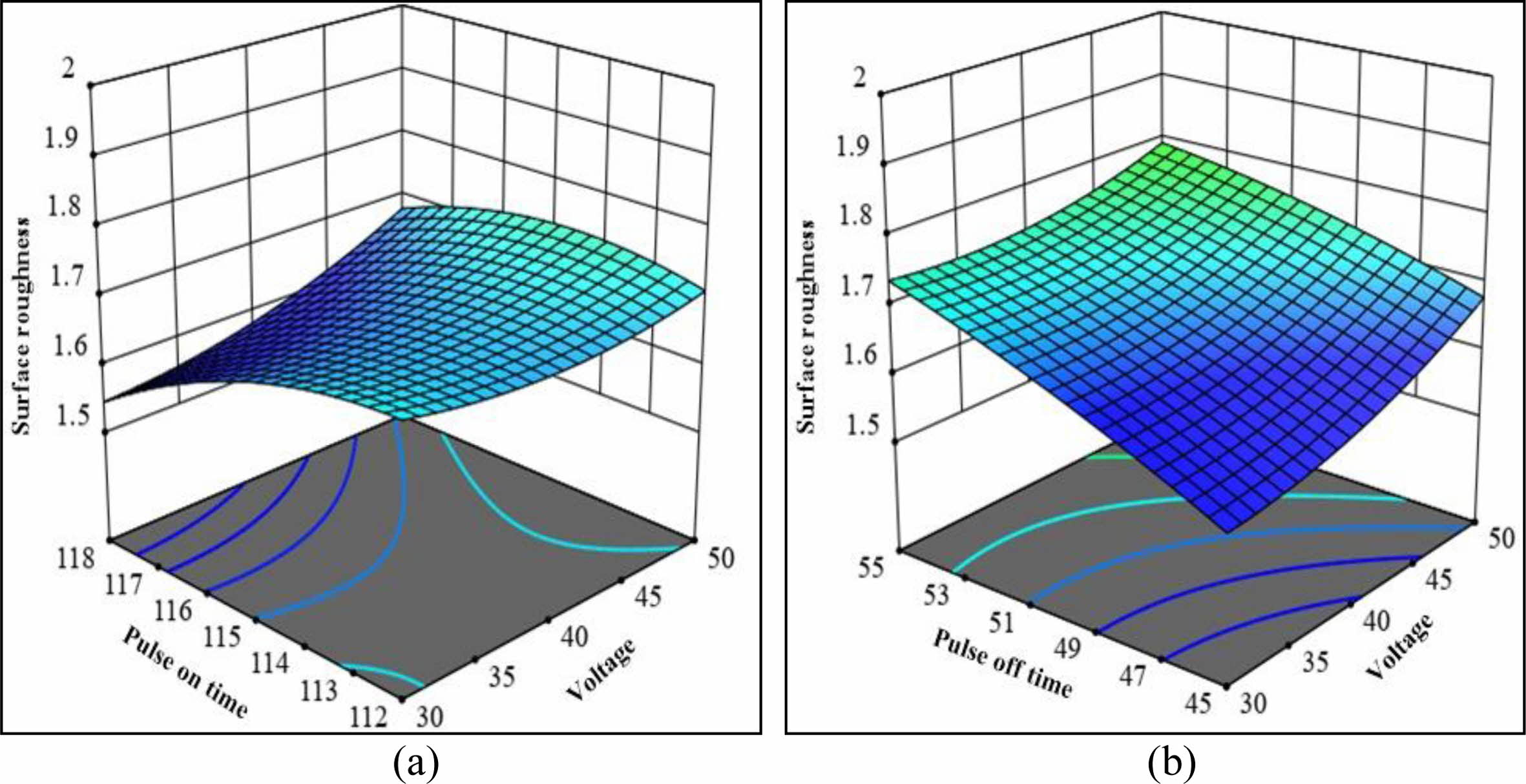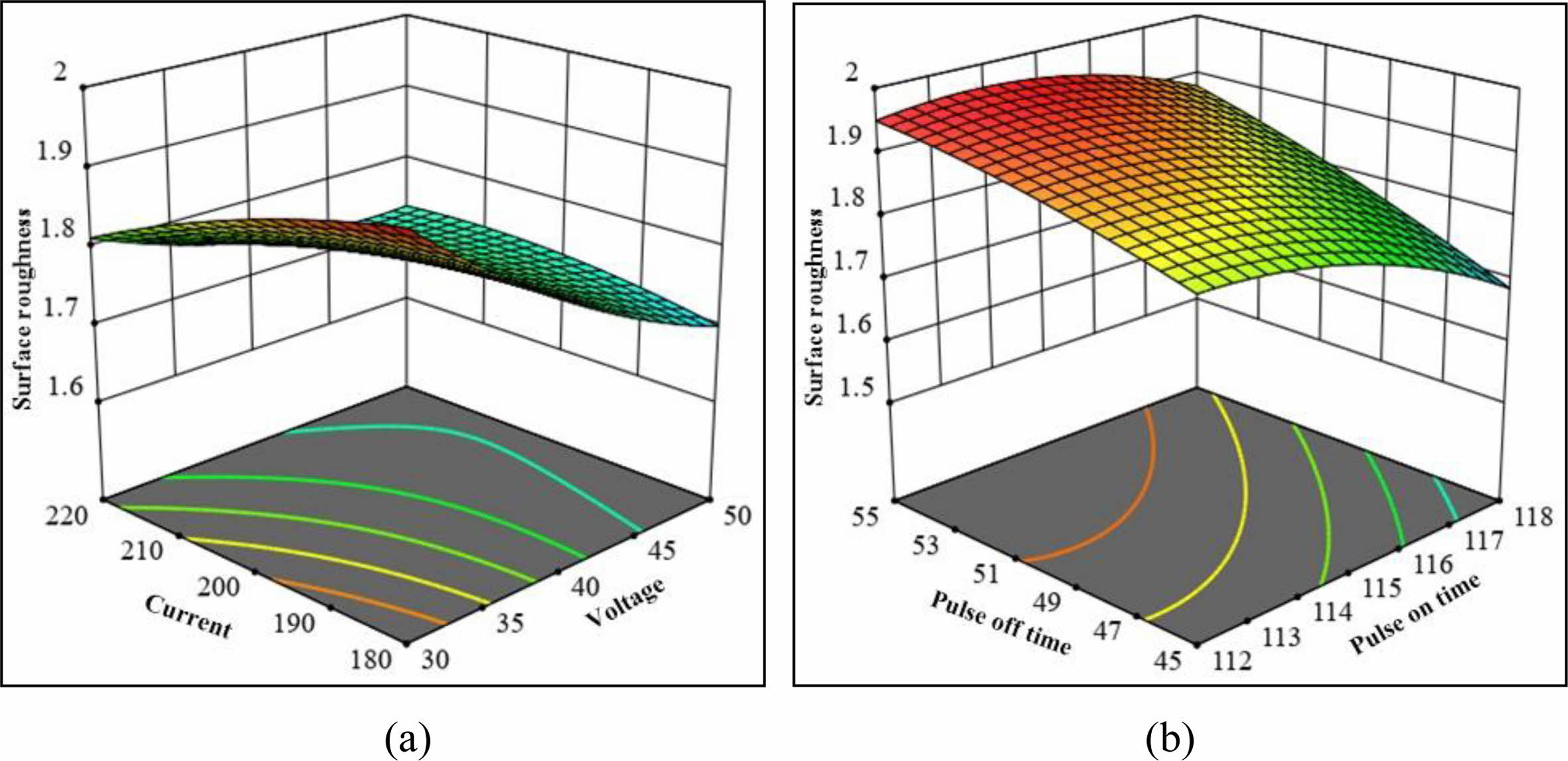 Fig. 7(a) depicts the interaction effect of peak current and voltage on Ra. It is observed that the increase in servo voltage will decrease Ra. Fig. 7(b) depicts the interaction effect of pulse off time and pulse on time is seen that decrease in Ra is due to increase in pulse on time. Fig. 8(a) and 8(b) depicts the interaction effect of pulse on-time, pulse off time and peak current on Ra. The increase in pulse on time and peak current will increase the Ra and increase in pulse off time will decrease surface roughness.