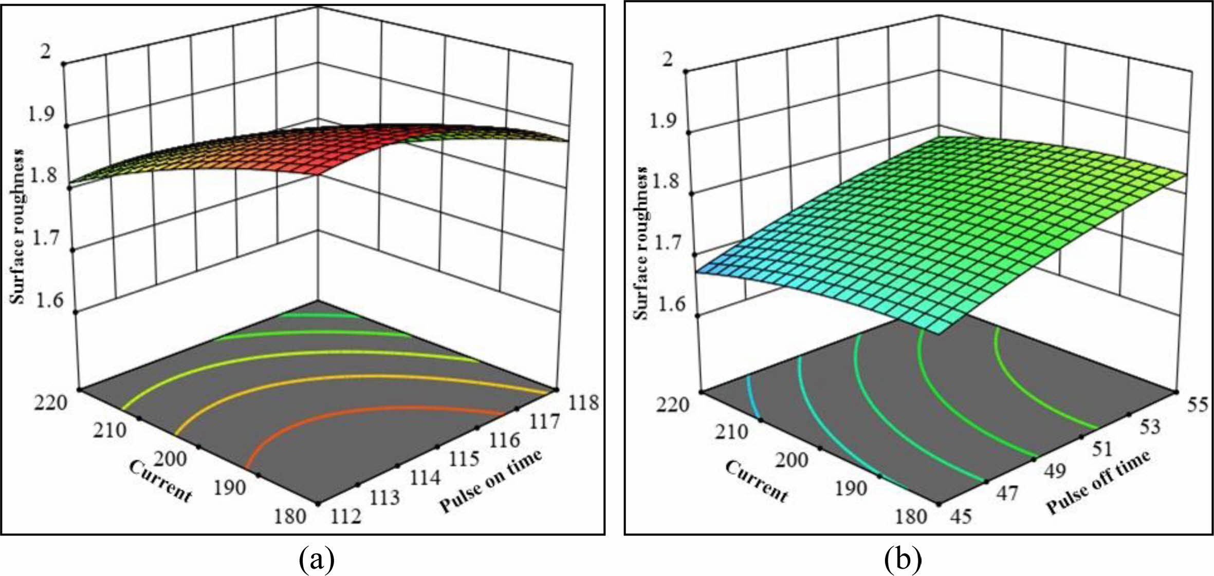 Fig. 8 (a) Ra vs. Ton and I, (b) Ra vs. Toff and I. |