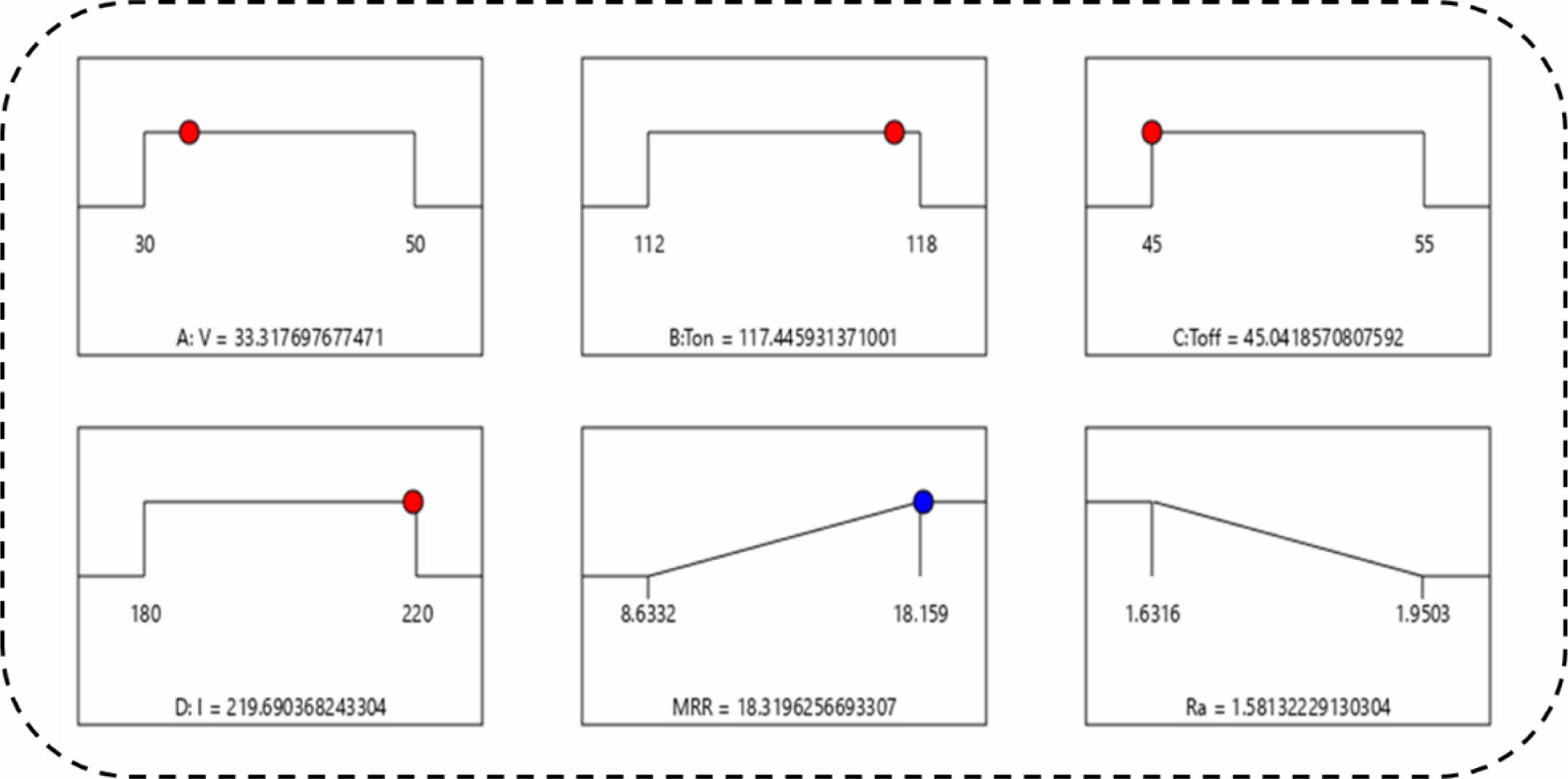 Fig. 9 shows the optimized values of the machining parameters for achieving minimum Ra and MRR in aluminium-based HMMC Al6010 (10% SiC and 15% Al2O3) Zinc coated brass wire electrode tool. The coded values for the optimal solution are found as (V, Ton, Toff, I): (33.32 volts, 117.44 ms, 45.04 ms, 219.70 amps). The minimum Ra obtained is 1.58 mm and the experimental minimum is 1.63 mm. The value of composite desirability (D) obtained is 1. The optimize result obtained for MRR corresponding with optimal process parameters viz., 33.32 volts, 117.44 ms, 45.04 ms, 219.70 amp. respectively. The predicted MRR is 18.32 mm3/min and the experimental maximum is 18.20 mm3/min which show the effective and accuracy of the developed model. Fig. 10 shows the desirability plot for optimizing both the responses simultaneously which also gives the optimal solution.