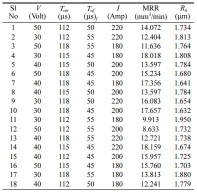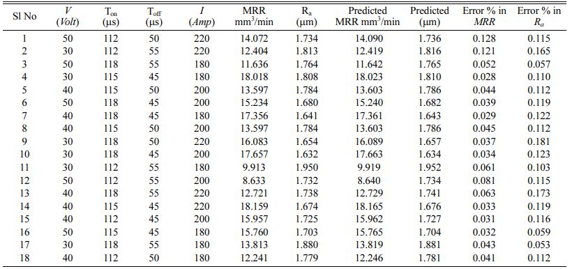 In this section, MRR and Ra of cutting material are investigated by using RSM. RSM model is used to analyse machining parameters in the WEDM process. The experimental data and mathematical data as shown in Table 2.