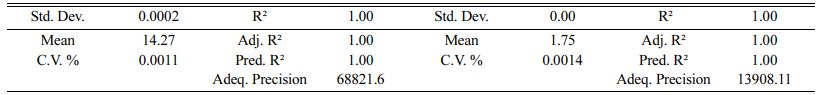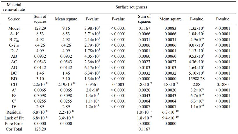 For fitting MRR and Ra in the model, backward elimination is used to exclude non-significant terms. In the present study a = 0.05 which is considered to be 95% accuracy. It is found in Table 4 that the F value of the model is 3.98´108 and the related p-value is < 0.0001, resulting in a significant model for MRR and F value of the model is 1.32´107 and the related p-value is < 0.0001, resulting in a significant model for Ra.