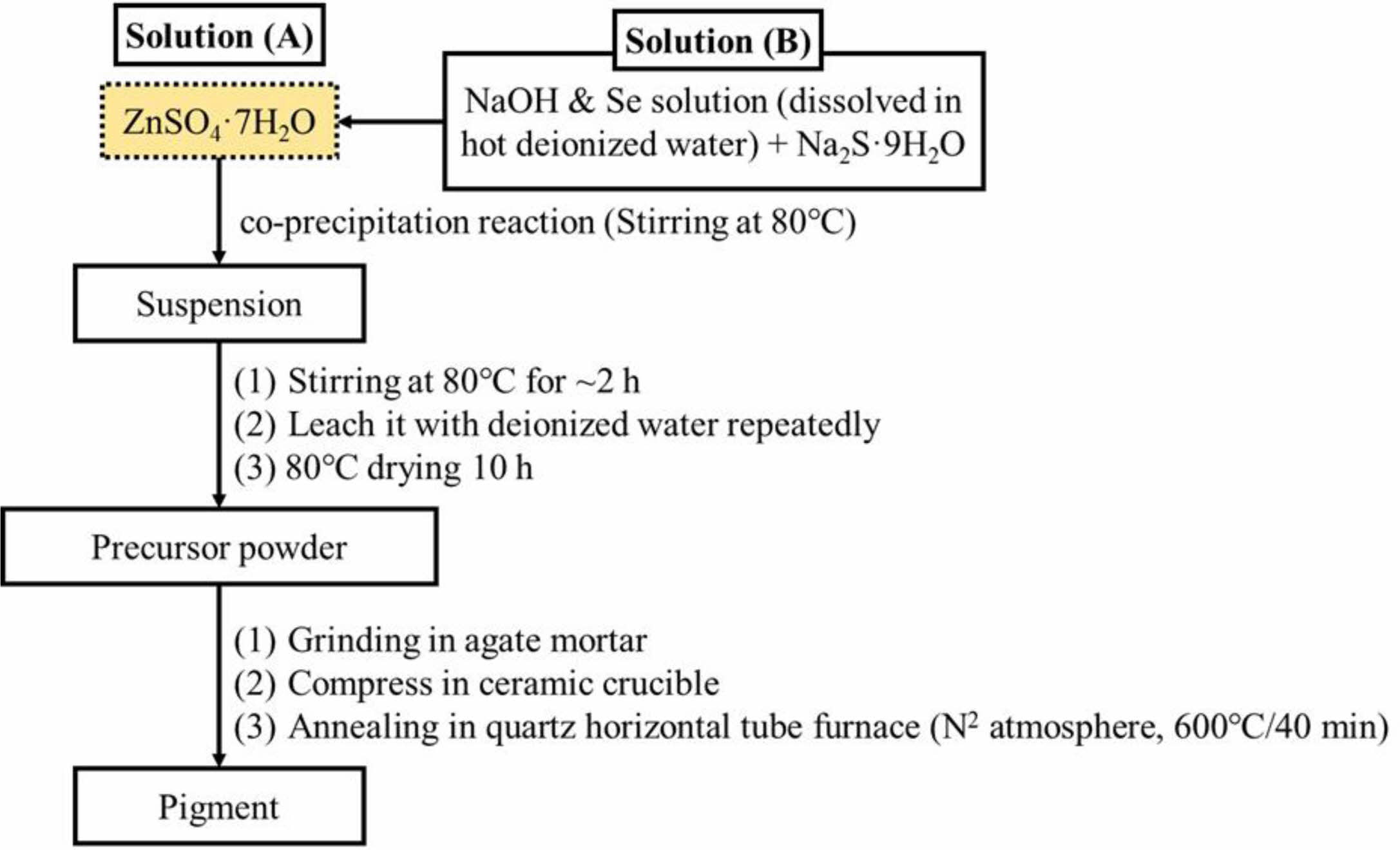 ZnSxSe1-x pigments (x = 1, 0.75, 0.55, and 0.35) have been synthesized by acoprecipitation reaction and subsequent calcination (Fig. 1) using ZnSO4·7H2O (99.5%), Na2S·9H2O (98%), Se (99%), and NaOH (97%) as starting materials, which have been supplied by the Sinopharm Group Co. Ltd., China. Regarding the compositions of ZnSxSe1-x precursors, the x value is noted to change (Table 1).