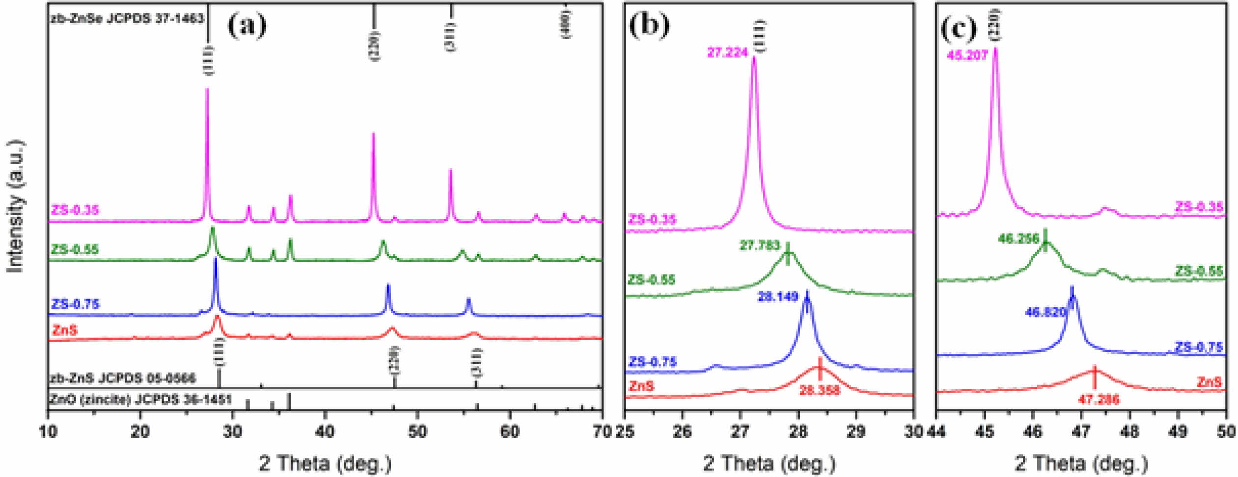 Fig. 2 (a) XRD patterns of ZnSxSe1-x (x = 1, 0.75, 0.55, and 0.35) pigments; (b) Bragg reflection shifts for (111) plane; and (c) for (220) plane |