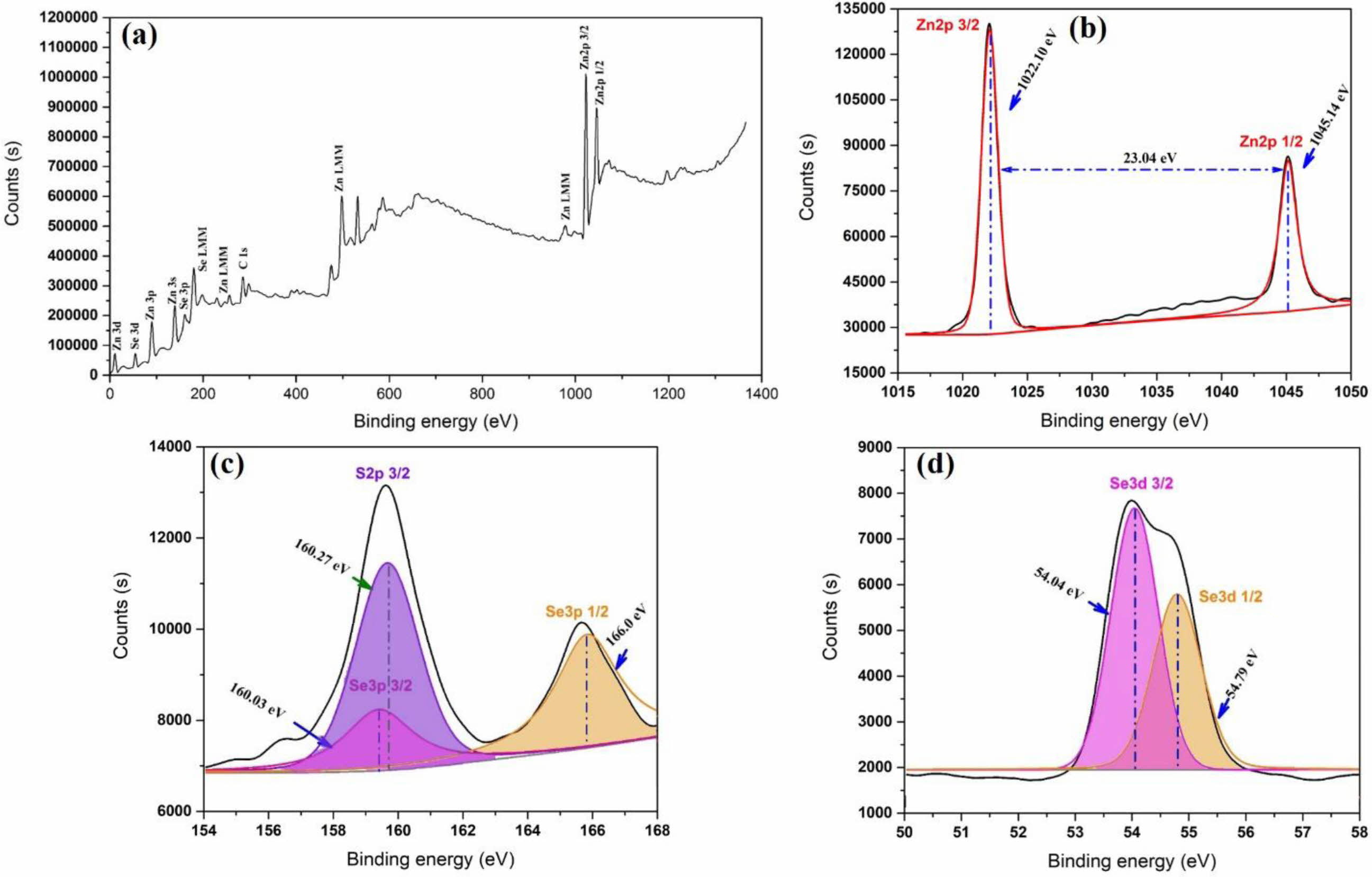 Fig. 3 shows the XPS spectra of the ZnSxSe1-x(x = 0.35) pigment, while Fig. 3(b) shows the high-resolution Zn 2p electron region. The binding energy interval 1022.1 and 1045.14 eV, and that between Zn 2p3/2 and Zn 2p1/2 are characteristic of a Zn2+ oxidation state [26]. The chemical state of S 2p is shown in Fig. 3(c). The peak at 160.27 eV is ascribed to S 2p3/2, which is in agreement with the 160–164 eV scope attained for S in the sulfide phase [27]. The locations of the major peaks (54.04 and 54.79 eV) represent Se 3d3/2 and Se 3d1/2, respectively, indicating that element Se mainly exists as a chemical state of Se2− [28], as shown in Fig. 3(d).