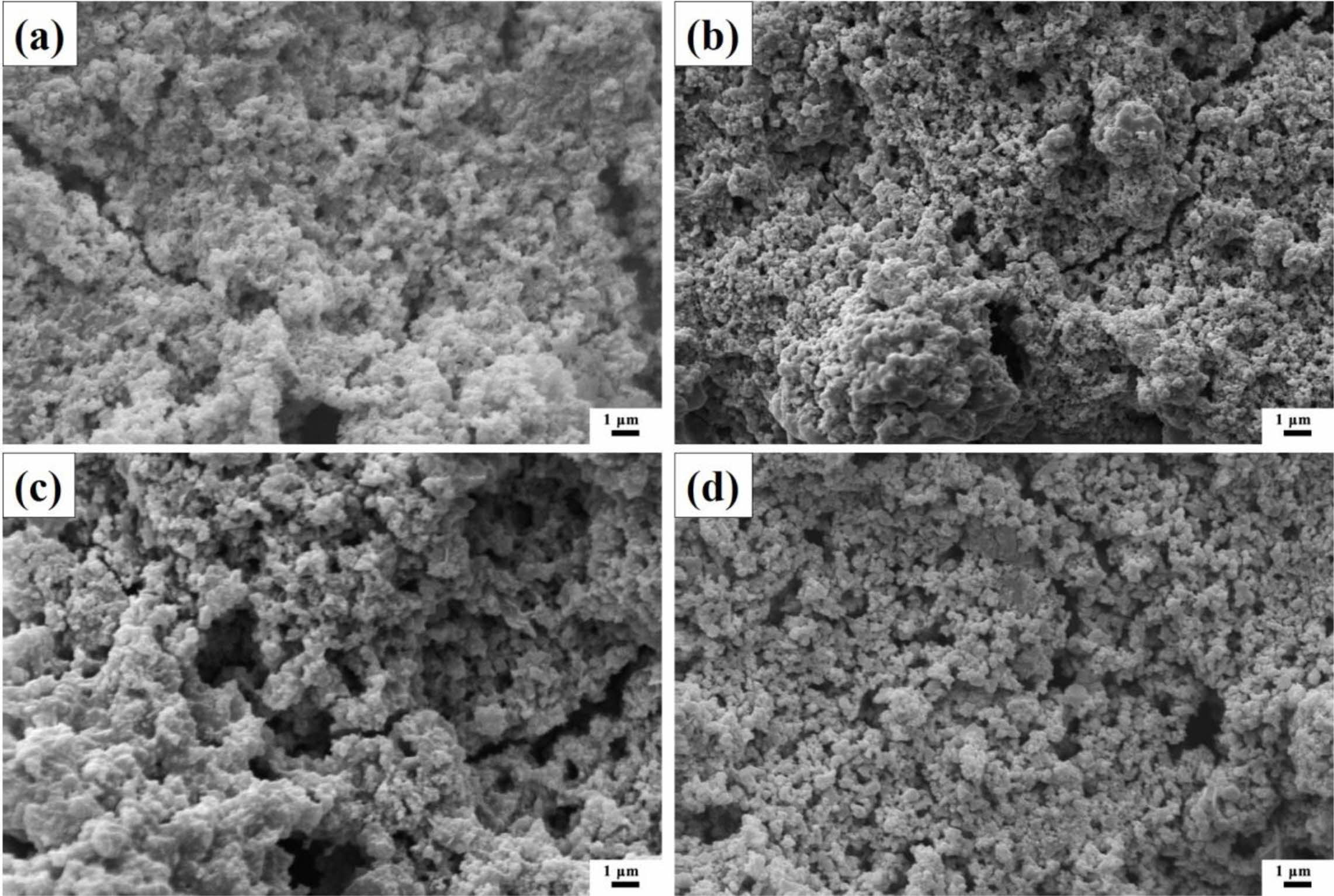 Fig. 4 SEM micrographs of ZnSxSe1-x pigments: (a) ZnS; (b) ZS-0.75; (c) ZS-0.55; and (d) ZS-0.35. |