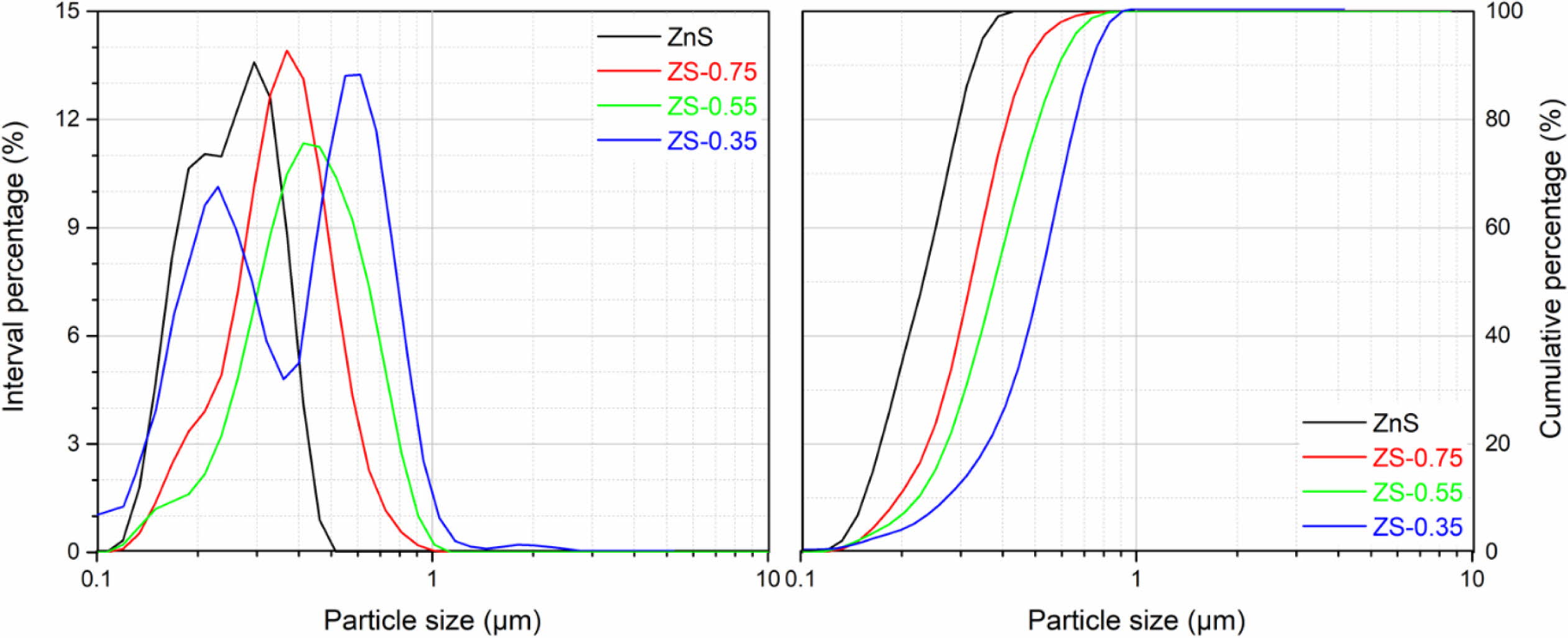 Fig. 5 Particle size distributions of ZnSxSe1-x pigments. |