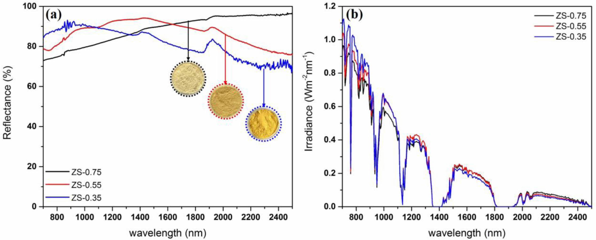 Fig. 8 (a) NIR reflectance and (b) NIR solar reflectance of ZnSxSe1-x pigments. |