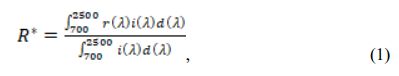 where r(λ) is the spectral reflectance (W·m−2), and i(l) is the standard solar spectrum (W·m−2·nm−1) obtained from the ASTM standard G159-98.
