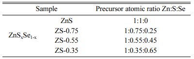 Table 3 shows the influence of the x component ratioon L*, a*, and b* ZnSxSe1-x parameters. As the x value decreases, brightness (L*) increases from 67.58 to 81.85. The yellow chromaticity (b*) of the samples depends on the degree of Se2− substituting S2−. With the increase of Se content, the b* value consistently increases from 33.57 to 56.58, indicating that the yellowness of the sample is enhanced.