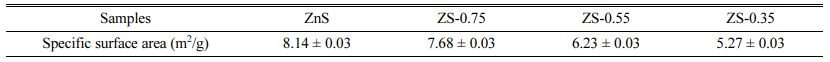 The specific surface areas of ZnSxSe1-x pigments are shown in Table 2. According to the BET test results, the specific surface area of the ZnS sample is 8.14 ± 0.03 m2/g. As the x value decreases, the specific surface area of ZnSxSe1-x pigments gradually decreases to 5.27 ± 0.03 m2/g (x = 0.35).