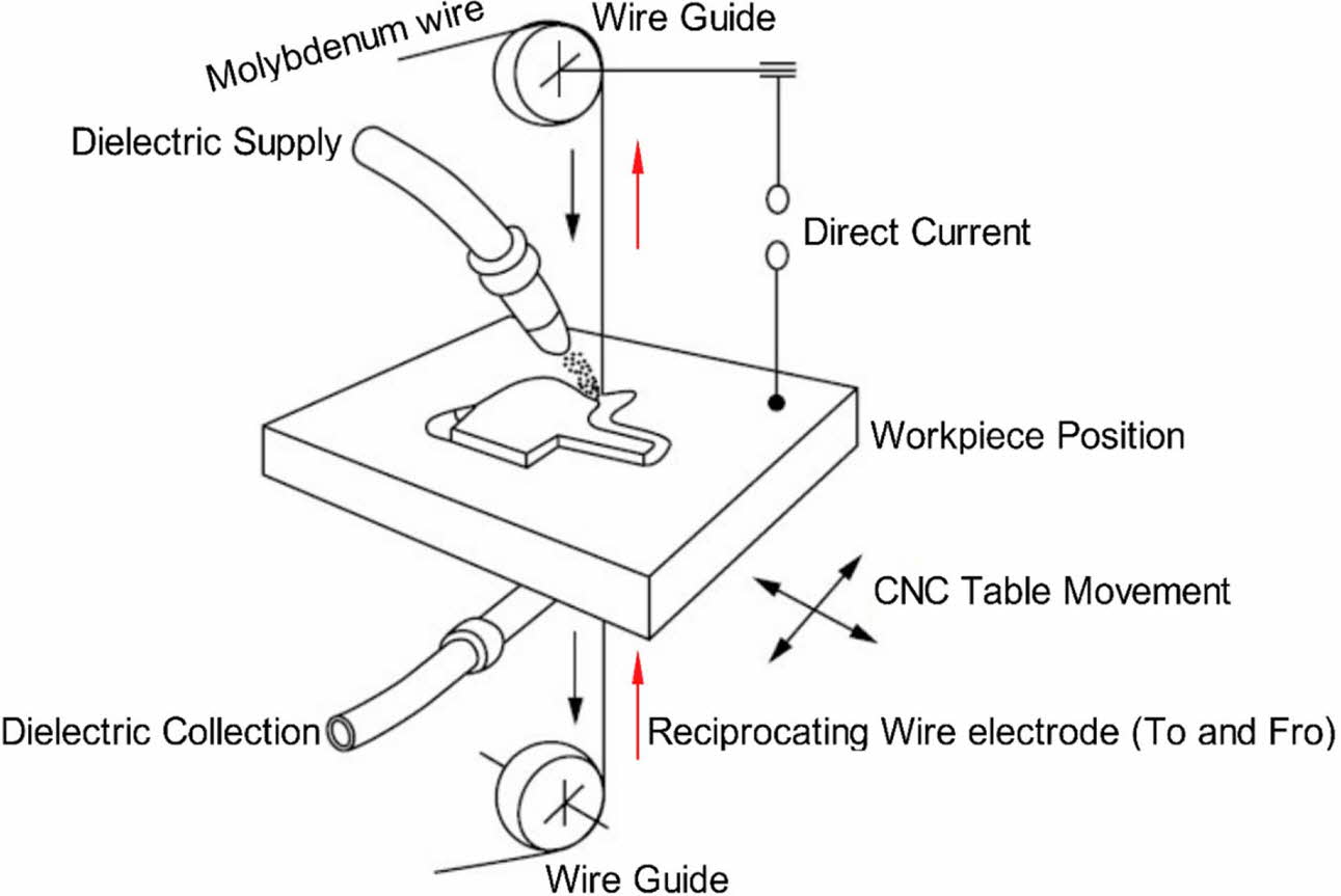 CNC WEDM machine releases impulse voltage towards workpiece and wire electrode through the sources that is controlled by the servo arrangement, to achieve a specific gap, and then discharges impulses in the fluid medium across workpiece and wire electrode [15]. As a result of the degradation of impulse discharging, a large number of small holes develop, giving the workpiece the desired shape. The cathode of the impulse power source is connected to the wire electrode and the anode of the impulse is connected to the workpiece. When the workpiece approaches the wire electrode in the dielectric fluid as the spark gap gets reduced to a definite value, dielectric liquid is broken through; very quickly forming a discharge channel and occurs an electrical discharge which releases extreme temperatures higher than 10000 oC instantly and the workpiece that is eroded cools down quickly under the influence of dielectric fluid and is flushed away [16]. Fig. 2 shows a schematic representation of reciprocating type WEDM where the molybdenum wire moves in to and for motion during the machining process.