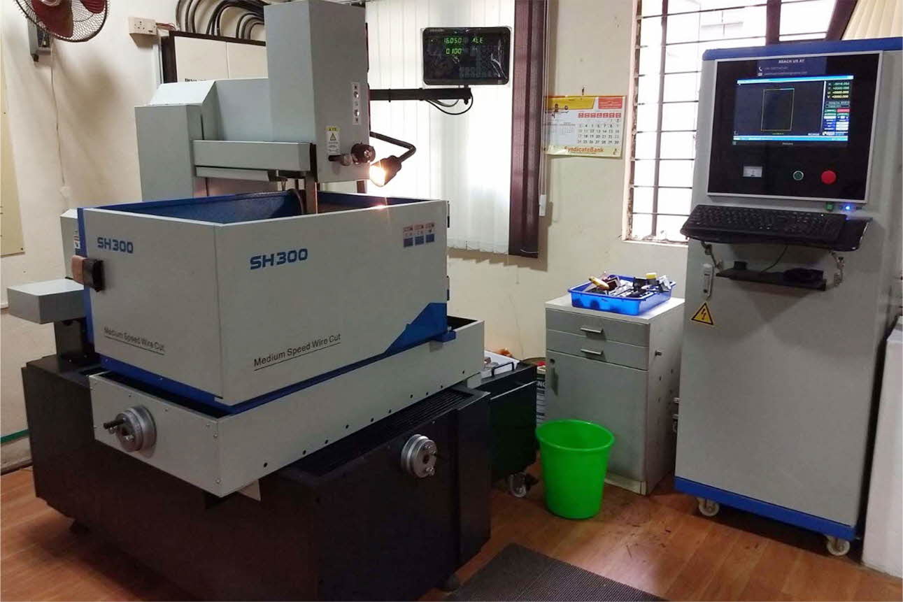 The specification of SH-300 model RWEDM CNC machine is: Table travel of 300´400´250 mm, table size 550´680 mm, max workpiece weight of 350 kg, max cutting taper/angle of ±3o / 80 mm, wire diameter of 0.16-0.20 mm, repeatability of ±0.003 mm, power capacity of 3KVA with pure water as working solution.