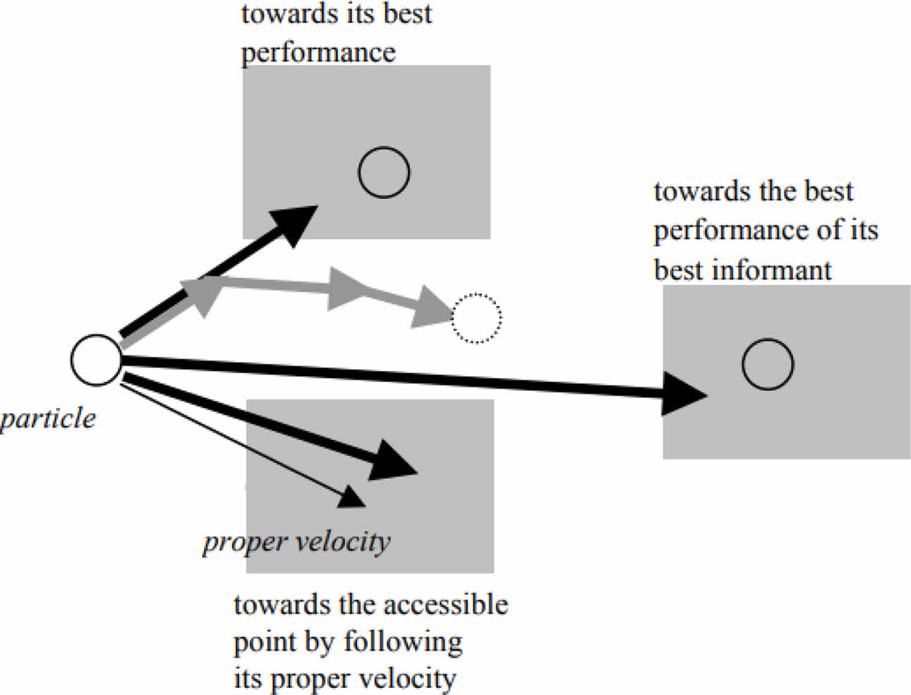 Fig. 4 Diagram representing the movement of particle in PSO towards the global best. |