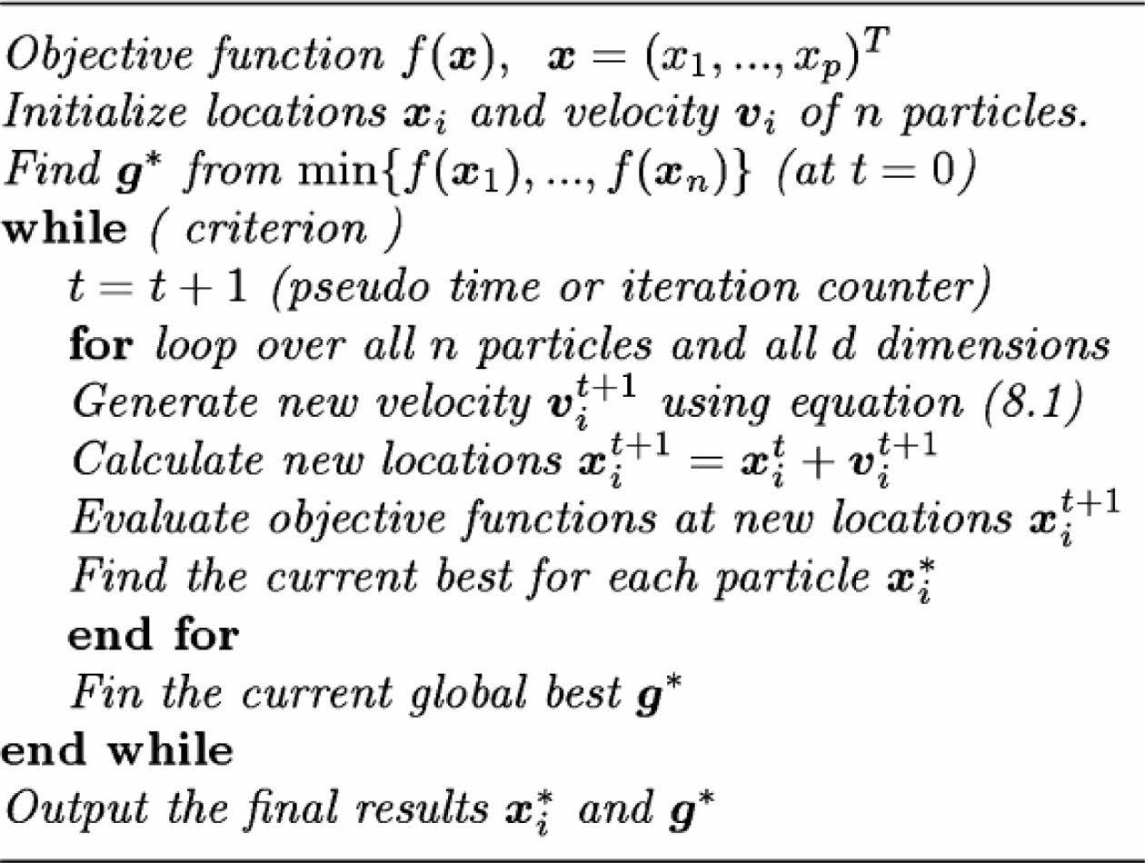 The basic procedure of implementing PSO consists of: (i) initializing PSO parameters, particles velocities and positions based on n-dimensional problem search space, (ii) compute particles initial local best positions and initial global best position using objective function, (iii) update each particles position and velocity, (iv) for each particle compute the objective functions, (v) update each local best particle using computed objective functions values, and (vi) update global best particle using computed local best particles objective functions values. The mainprocedures in PSO are summarized in pseudo code presented in Fig. 5.