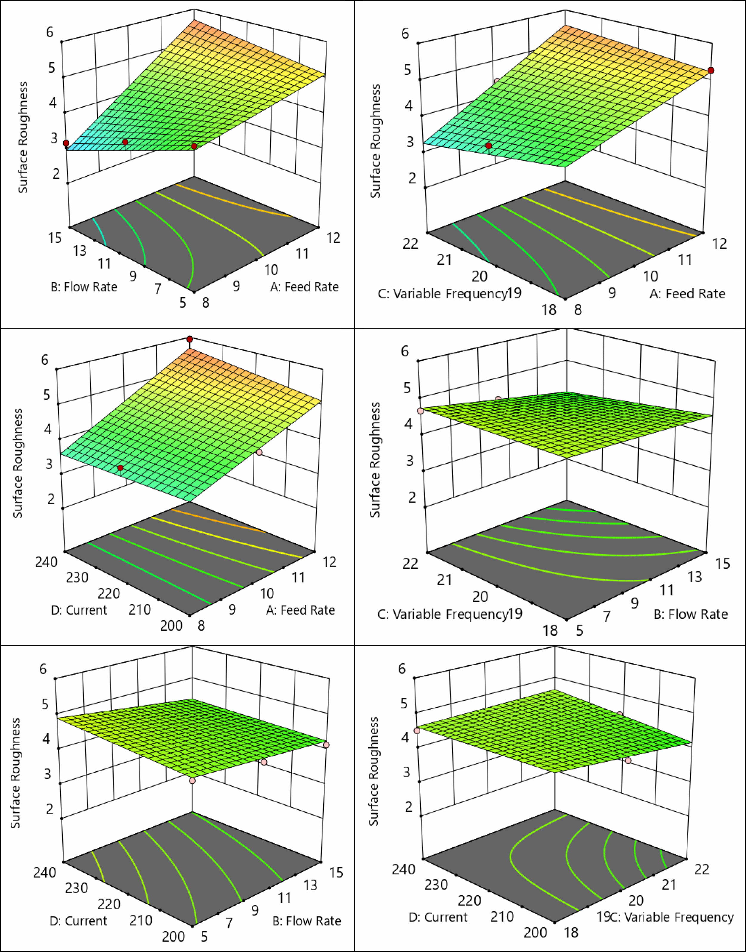 Further towards understanding the influence of input factors on the obtained responses, 3D surface plots are drawn. Fig. 6 presents the 3D surface graphs plotted among the SR and considered inputs. Higher rate of feed obviously increased the SR in a linear trend whereas higher flow rate of dielectric considerably reduces the SR in a linear manner. A linear relationship exists among the variable frequency and SR and also with current as it is represented by linear variation. Increasing the variable frequency lowers the SR but with increase in current SR tends to increase [51].