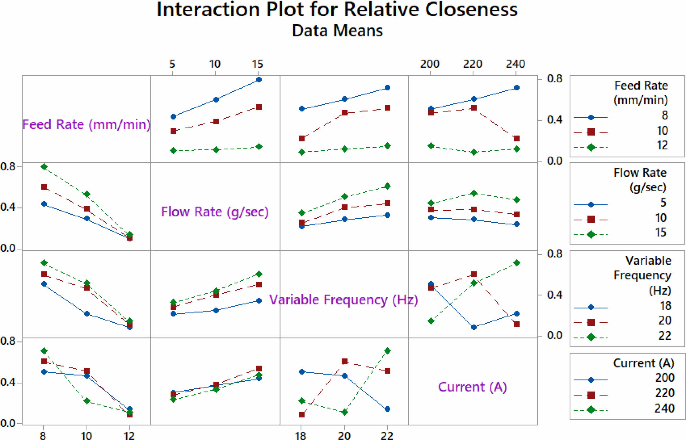 When planned experiments incorporate several factors, the potential for each component to interact with another one or more factors rises quadratically. This may be achieved through the effects of one factor [54] and another. Most of the times no combined impact between the components is experienced in the interaction chart when lines are comparable; when differences occur between two factors, a coexistence is across the variables. The more interactive the lines, the wider the distance between the components [24]. Fig. 10 shows the consequence of inputs on relative closeness during RWEDM of titanium grade 2 alloy. It is observed that no interaction is perceived among feed rate and flow rate and also between feed rate and variable frequency. But a moderate combinatory influence is observed among feed rate and current density. Similarly, no interaction is observed among flow rate and variable frequency and among flow rate and current density. A stronger interaction is seen between variable frequency and current as their relationship is represented by means of nonparallel lines.