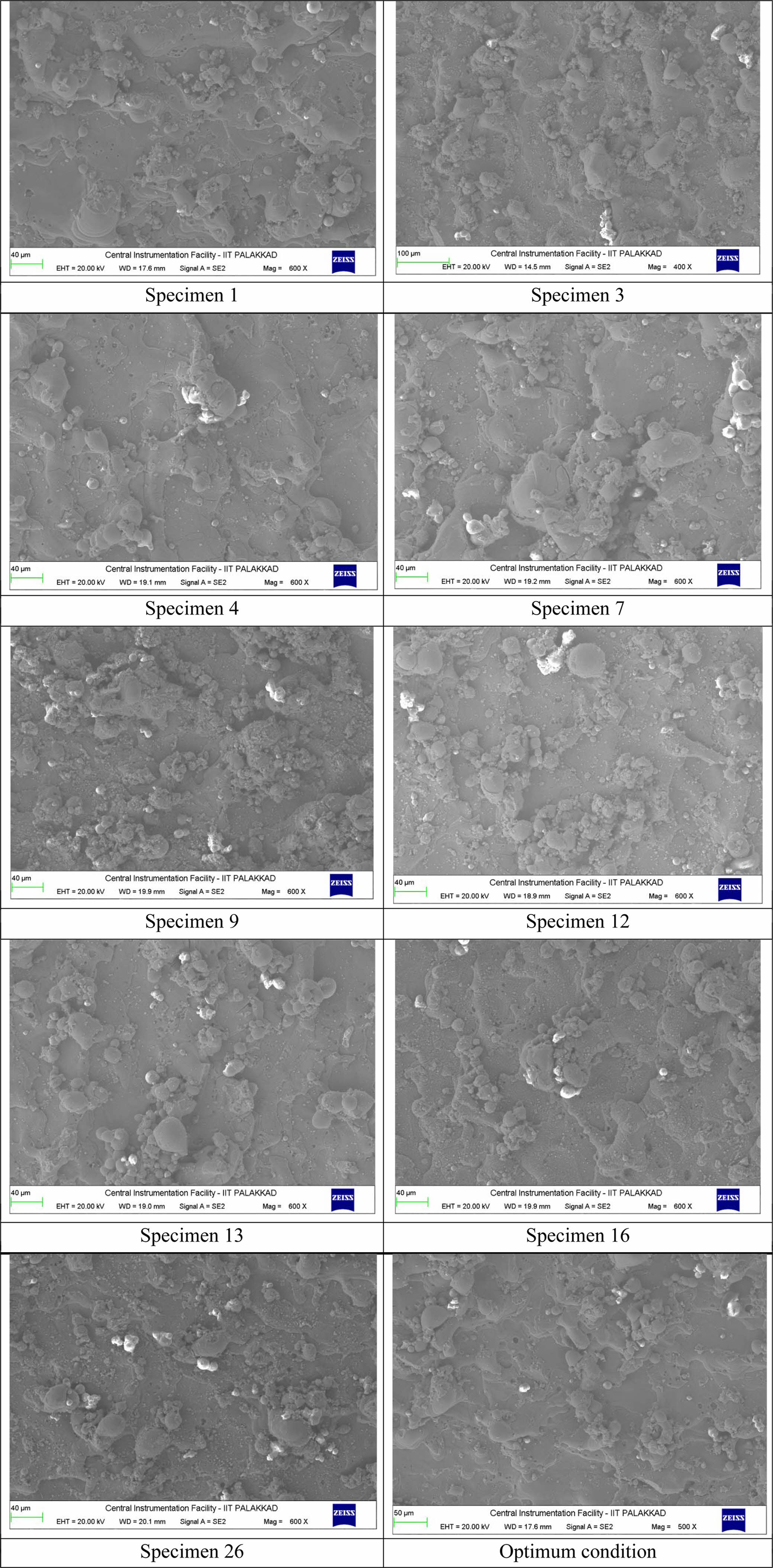 Fig. 12 depicts the SEM pictures taken from the workpiece surface for the analysis of the recast layer. The refurbishment layer consists of melted metal particles which have been placed on the workpiece's surface. Workpiece erosion can be visualized and melted materials are seen as clusters formed because of the solidification of the eroded materials. Higher current rises the discharge energy in the spark gap which accelerates melting and evaporation of workpieces. Due to higher temperature dielectric is unable to flush the eroded and melted materials which solidifies in the surface of machined workpiece [59]. Voids and micro- cracks might potentially include the HAZ and the recast layer, which could induce key component stress failures. Recast strands are unwanted, because they can be fractured and broken and variation in hole form and size can be introduced[60]. It is seen that the workpiece is less distorted and that the refurbishing layer is lower in thickness.