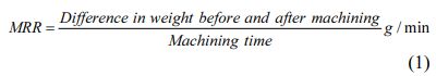 The output responses considered are average value of surface roughness (Ra) measured on the workpiece surface after machining, kerf width (KW) obtained during machining and rate of material removal (MRR). Ra is calculated using the Mitutoyo Surftest SJ-210, which has a measuring span of 17.5 mm (X axis) and 360 m (Z axis) with 0.25 mm/s of measuring speed along with gaussian filter and 0.75 mN measuring forced and a cut-off of 0.08 mm. KW is determined by using optical microscope which is roughly twice of wire offset added with wire diameter. MRR is determined based on the formulate provided in Eq. (1) [34].