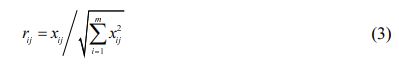 This practice aims to alter the numerous attribute dimensionality into non-dimensional qualities so that they can be compared. One method is to split every criterion's result by the average of the overall outcome vector of the condition in question [39]. The normalized decision array R's element rij could be computed as:
