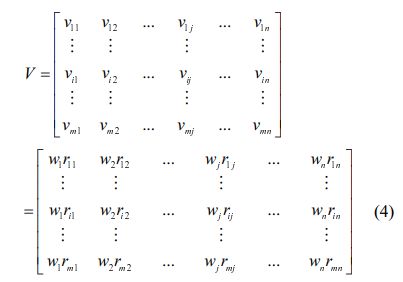 provided by the person making the decision is included into the decision matrix. By multiplying the matrix column R with the provided wj this matrix can be obtained. As a result, the weighted normalized decision matrix V equals: