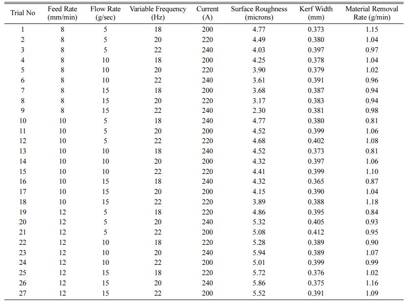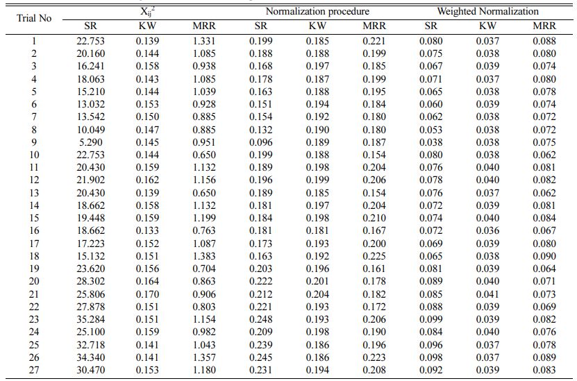 With the designed experimental matrix (L27 OA) machining is performed on RWEDM setup and the output responses viz., SR, KW and MRR are measured and recorded as in Table 3. Outcomes show that higher wire electrode rate of feed, SR and KW increases with decrease in MRR [47]. On contrary with higher flow rate of dielectric among the workpiece and non-utilizable electrode, higher MRR is obtained with lower SR and KW [48]. Increasing the variable frequency substantially increases the higher removal of material from the workpiece along with higher KW but a better surface finish is obtained. The influence of current on the output shows that with rise in current during machining MRR, SR and KW tends to lower [49, 50].