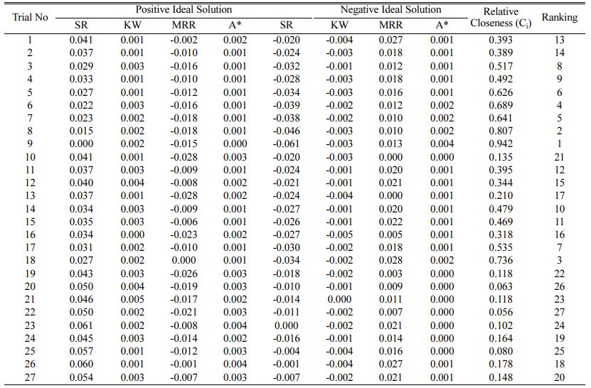 After mathematical model development, optimization is carried out for enhancing the RWEDM performance by simultaneously optimizing the SR, KW and MRR. This work minimizes SR and KW for better surface integrity and quality whereas maximizing MRR for achieving higher cutting speeds and productivity. For multicriteria optimization TOPSIS procedure is imple- mented. The first phase is to turn the outputs into a standard sequence (i.e., conversion of values within 1 and 0). Table 4 shows SR, KW and MRR data that are standardized between 0 and 1 and subsequently weightages are supplied to SR, KW and MRR after normalization method. Equal weightage (40%) is considered in this analysis towards SR and MRR whereas for KW 20% weightage is considered as more importance is given for surface integrity and productivity. On the basis of the eq. (4) provided, Table 5 shows the established positive optimal solutions (max for MRR and min for SR and KW) and negative ideal solution (min for MRR and max for SR and KW)obtained for SR, KW, and MRR. As per Eq. (8) the values of relative closeness (Ci) are determined for combined characteristics of SR, KW and MRR as displayed in Table 5. From the values of relative closeness grading is given as per the ideal values that are nearer to 1.