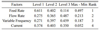 5. ANOVA analysis presents that with 67.12% contri- bution, tool feed is the critical factor that influences higher continued by flow rate with 12.3% contribution, variable frequency with 9.81% contribution. The least contributing parameter is current density with 0.74%. The R2 value obtained during analysis is 89.7%.