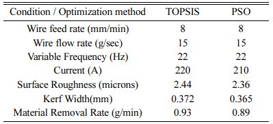 6. The optimum condition evolved from PSO are: 8 mm/min of wire electrode feed rate, 15 g/sec flow of dielectric medium, 22 Hz of variable frequency and 220 A of current density with a predicted SR of 2.36 microns, KW of 0.365 mm and MRR of 0.89 g/min. From the comparison of outcomes from TOPSIS and PSO there is deviation of SR by 3.27%, KW by 1.88% and MRR by 4.3% which is close enough for better optimization conditions.