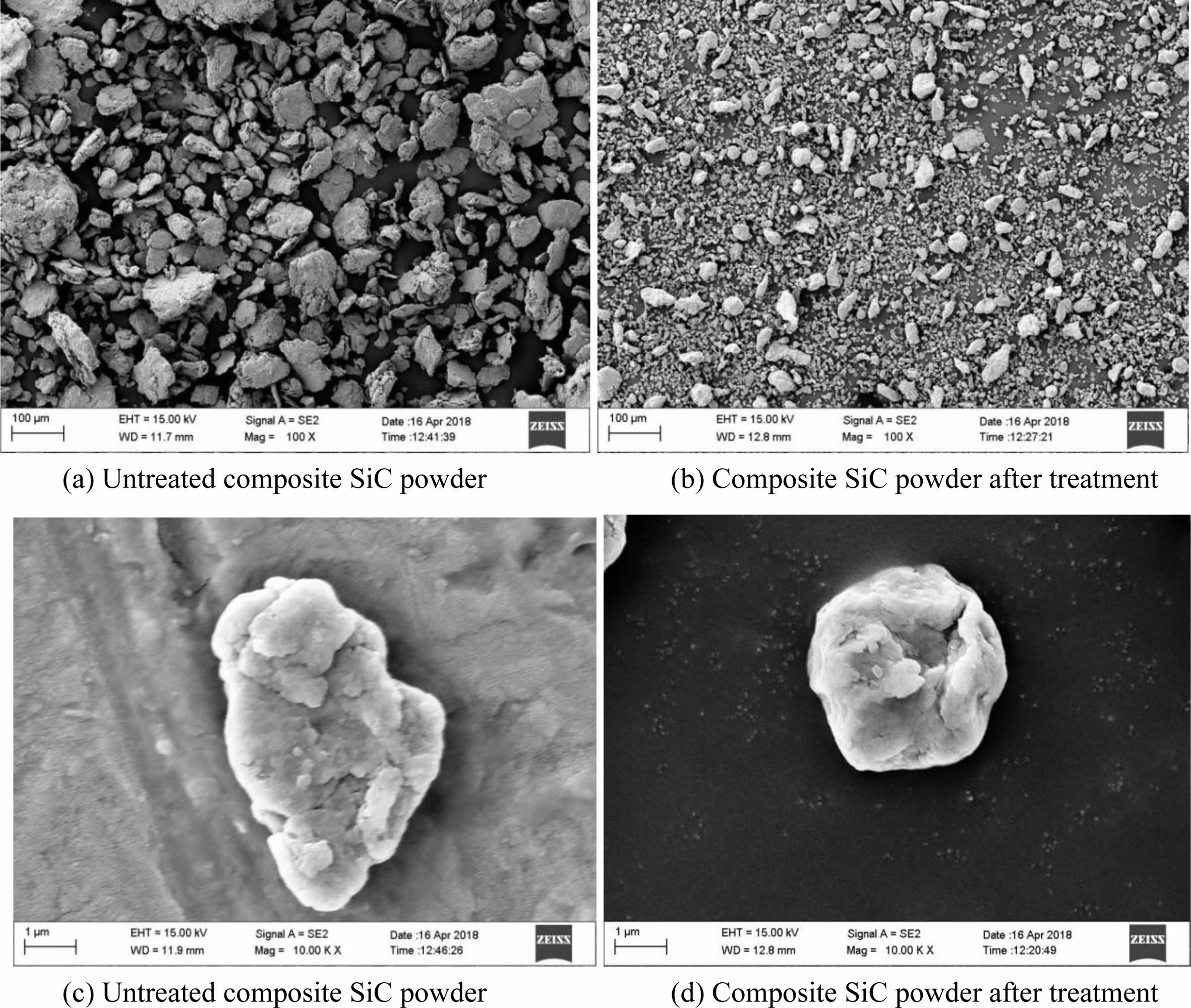 Fig. 3 shows the SEM analysis and test results of composite SiC powder. It can be observed that the composite SiC powder before modification (i.e., in the original state) has large edges and corners, and the particles of the SiC powder are irregular. After modi- fication, the roundness of the composite SiC powder is significantly improved, the edges and corners have disappeared, the distribution is close to circular, and the particle size of the powder is significantly reduced.