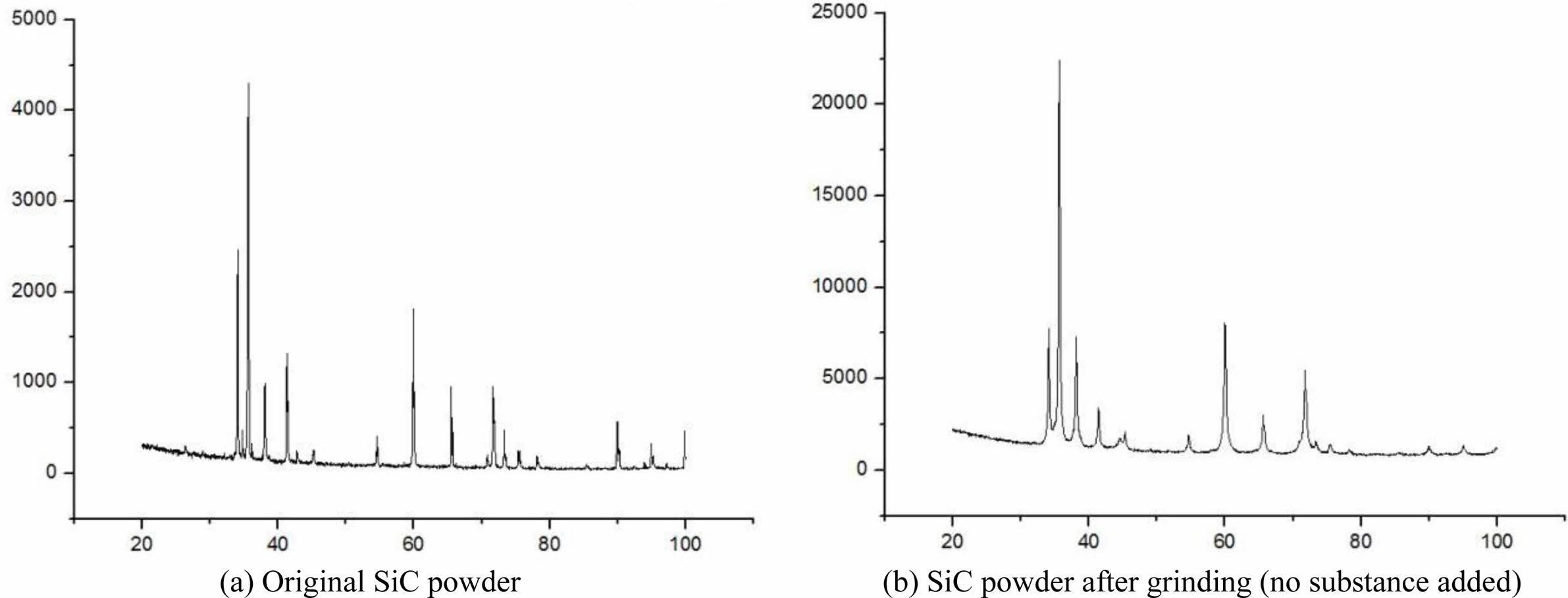 Fig. 4 The XRD test results of original SiC powder and ground SiC powder. |
