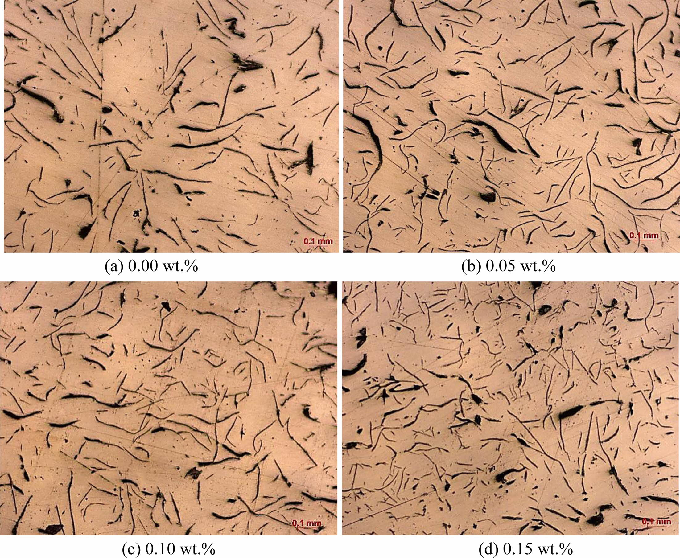 As shown in Fig. 7, after addition of composite SiC particles, the graphite precipitated during solidification of hypoeutectic gray cast iron is basically type A. After addition of 0.00 wt.% composite SiC powder into the sample, the number of flake graphite was small, the shape is flat, and the length of graphite was 0.46 mm; after addition of 0.05 wt.% composite SiC powder, the number of graphite considerably increased, the length of graphite was 35 mm, and it was obviously bent; After addition of 0.10 wt.% powder, the number of graphite grew further, the length of graphite decreased to 30 mm, and the bending tendency was more obvious; After addition of 0.15 wt.% powder, the number of graphite was the largest, the length of graphite was the shortest, which was 20 mm, and the graphite showed more even distribution. With the increase of the amount of composite SiC powder, the graphite became finer and the number increased gradually. Finer and more evenly distributed graphite corresponds to higher tensile strength.