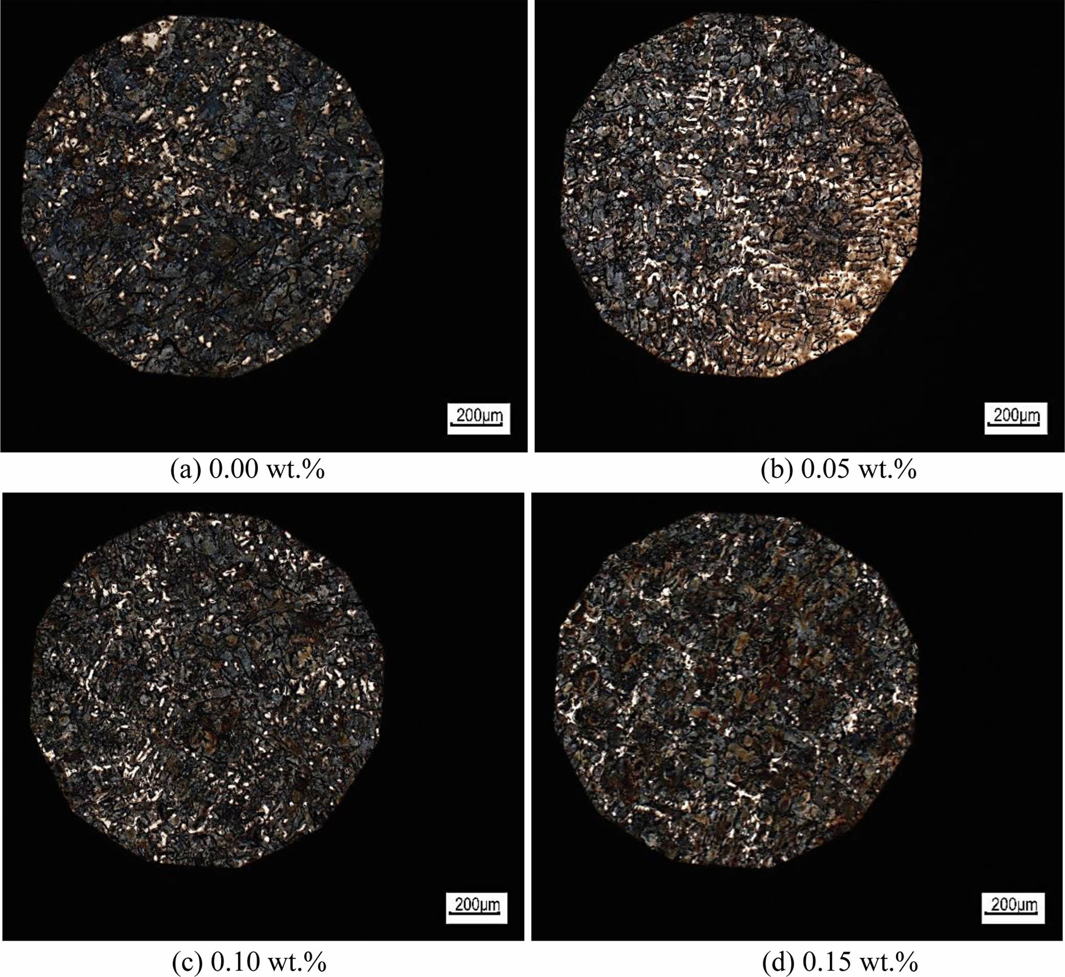 Fig. 8 shows the eutectic morphology of different composite SiC powders added after corrosion with 4% nitric acid ethanol solution. Without composite SiC powder, the eutectic grade of the sample was 7, and the grain was coarse and uneven (Fig. 8(a)). After addition of 0.05 wt.% composite SiC powder, the eutectic grade of the sample increased to 6, and the number of grains also increased (Fig. 8(b)). The eutectic grade rose to 5 after addition of 0.10 wt.% composite SiC powder, and the grains turned smaller (Fig. 8(c)). The eutectic grade of the sample with 0.15% composite SiC powder reached 4, with more grains and uniform grain size (Fig. 8(d)).