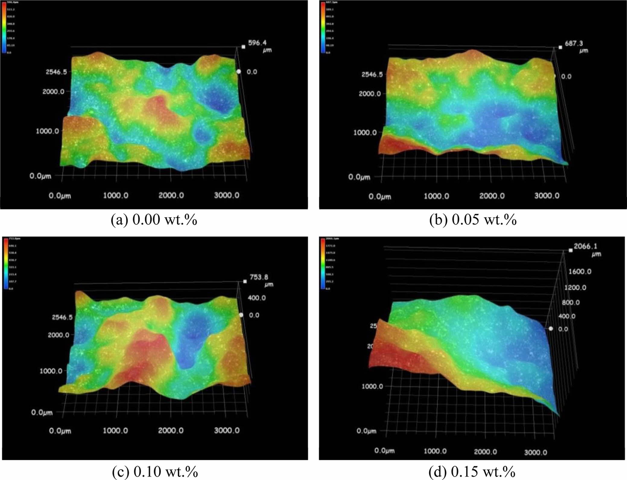 The three-dimensional morphology of the tensile fracture of composite SiC powder with various mass fractions of SiC is shown in Fig. 9. The fracture surfaces of the four samples had different three-dimensional morphology (Fig. 9). The maximum protrusion height of the tensile fracture of the sample with 0 wt.% composite SiC powder was 596.4 mm (Fig. 9(a)), and the maximum bulge height of the tensile fracture with 0.05 wt.% composite SiC powder was 687.3 mm (Fig. 9(b)). Thus, the maximum height difference of tensile fracture increased by 15.24%. The maximum bulge height of the tensile fracture with 0.10 wt.% composite SiC powder was 753.8 mm. Thus, the vastest height difference of tensile fracture increased by 26.39%. The maximum protrusion height of tensile fracture added with 0.15 wt.% composite SiC powder was 2,066.1 mm. Hence, the maximum height difference of tensile fracture increases by 246.43%.