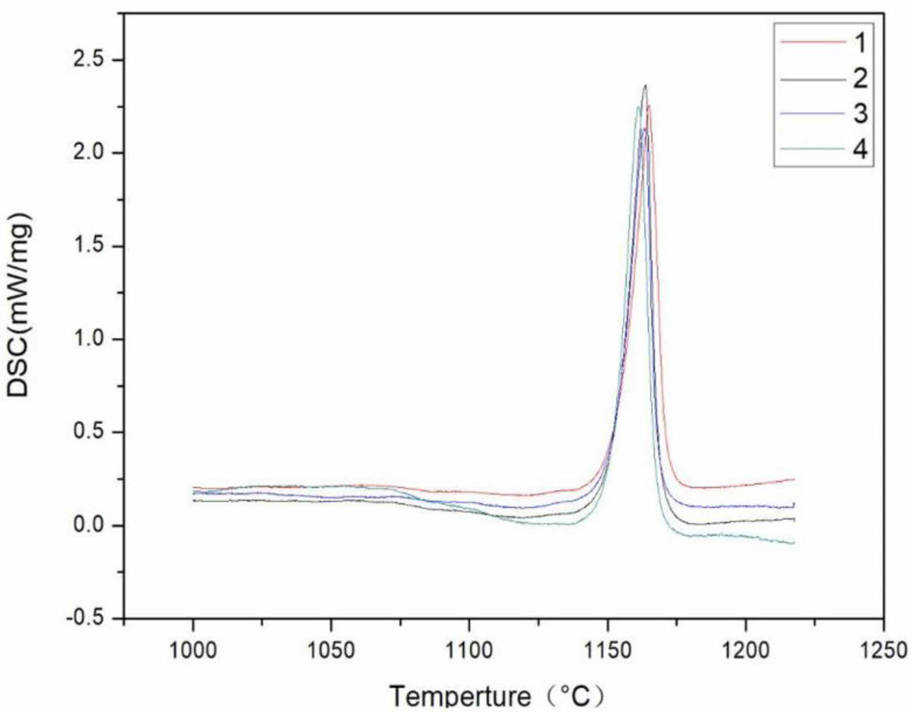 Fig. 10 The DSC curves of the different addition amounts of composite SiC powder: (1) 0.00 wt.%; (2) 0.05 wt.%; (3) 0.10 wt.%; (4) 0.15 wt.%. |