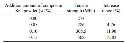 In hypoeutectic gray cast iron, the test results of tensile strength with different addition amounts of composite SiC powder at room temperature are shown in Table 5. Addition of composite SiC powder significantly improved the tensile strength at room temperature, and the increase range of tensile strength grew with the amount of composite SiC powder. For example, the tensile strength of the composite SiC powder was enhanced by 12.82% after addition of 0.15 wt.% SiC powder.